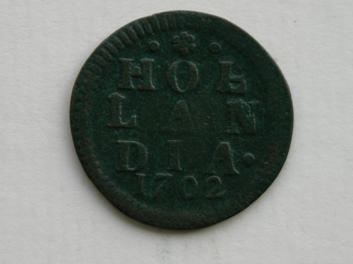 Duit - 1702, materiaal: koper, afmetingen: diameter 24 mm, duit met opschrift 'HOLLANDIA'
