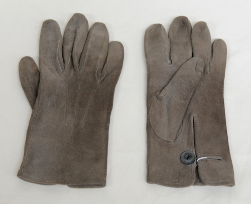 Heren handschoen, materiaal: zeemleer, kleur: grijs, knoopsgat met grijs parelmoer knoopje, maat 8