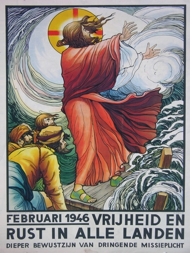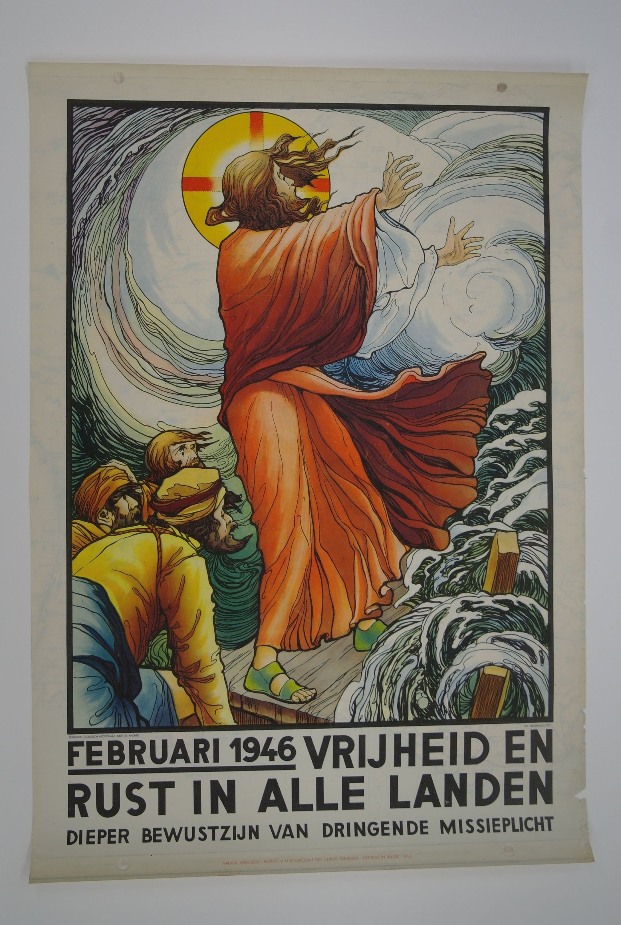 affiche met afbeelding van staande Jezusfiguur met apostelen op woeste zee, door Jos Speybrouck, daaronder de tekst: februari 1946 vrijheid en rust in alle landen, dieper bewustzijn van dringende missieplicht wegens papierschaarste kort na de oorlog gedrukt op de blanco achterkant van reeds bedrukte vellen. Gedrukt in België. Zie ook inv.nr 2001.09.23