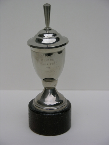 Prijsbeker op ronde houten voet met losse deksel, inschrift beker: 3e pr. j. 12 j. verp. distr. Ehv '75 NKGB, Prijsbeker op ronde houten voet met losse deksel, inschrift beker: 3e pr. j. 12 j. verp. distr. Ehv '75 NKGB, maten 15,5 x 4,5 cm, mataal/hout
