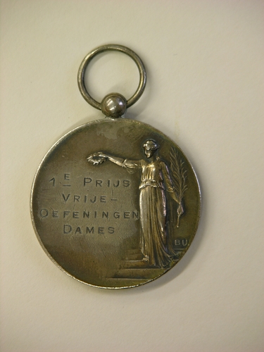 Ronde prijsmedaille/draagpenning. Recto: reliëfafbeelding van staande vrouwenfiguur (geheel volgens klassiek model) in lang gewaad met lauwerkrans in rechterhand en lauwertak in de linkerhand. opschrift B.U. (Begeer Utrecht). Inschrift: '1e Prijs vrije-oefeningen Dames. Verso: decoratief patroon, symmetrisch, door art-deco geïnspireerd. Zonnewijzermotief met datering '29/6/1919' inschrift 'Philips Sport Vereniging'. Met doorboord knopje/draagringetje