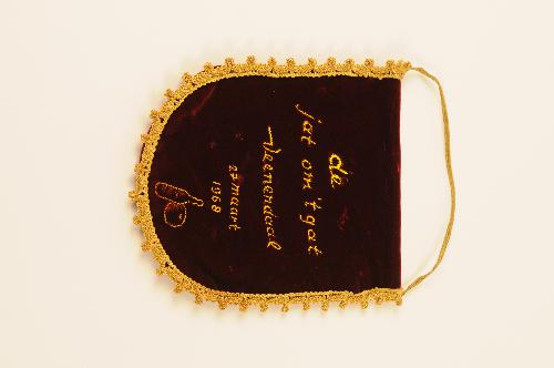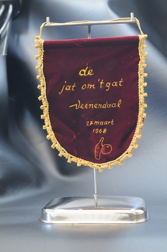 Prijstrofee Dameskegelclub 'Vol Moed' Eindhoven - 1968, trofee in de vorm van een klein vaandel van velours dat opgehangen wordt aan een verchroomd metalen standaardje. Velours, afgezet met een decoratieve band. Geborduurd opschrift: 'de jat om 't gat Veenendaal 27 maart 1968' + een afbeelding van een kegel met bal. Prijstrofee Dameskegelclub 'Vol Moed' Eindhoven - ...