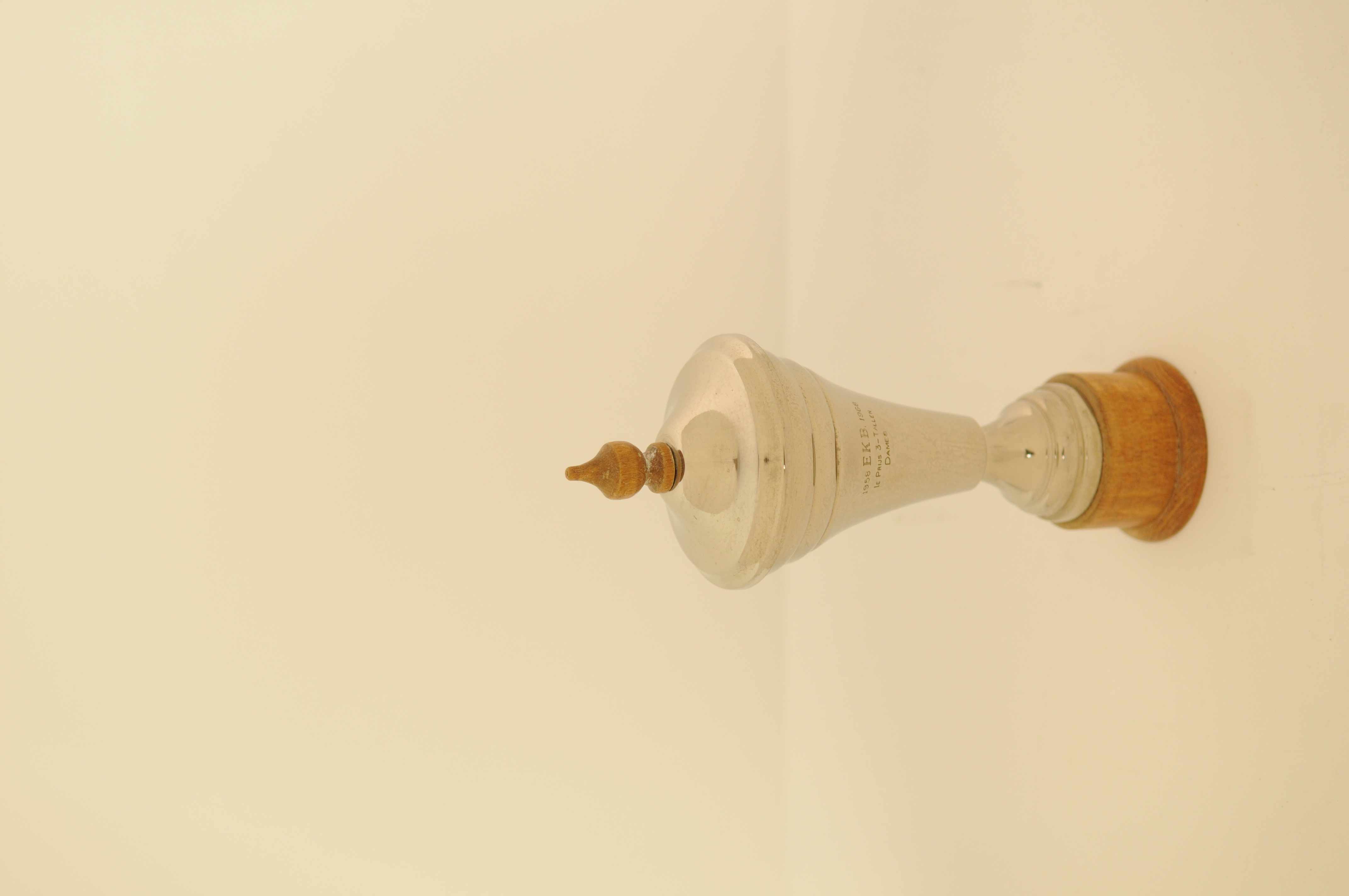 Prijsbeker Kegelclub 'Vol moed' Eindhoven, inschrift; E.K.B. 1968 1e prijs 3-tallen dames, metaal/hout, 19 x 7 cm