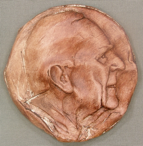 Ontwerp Frits Philipspenning - 2000, keramiek/beschilderd, diam. 94 mm, dikte 20 mm, ongesigneerd, portret Frits Philips en profil n.l., zowel vz. als kz. bewerkt: op kz. het opschrift '2000 MUSEUM KEMPENLAND EINDHOVEN FRITS PHILIPS' Een van de schetsontwerpen die de kunstenaar gemaakt heeft voor inv.nr 2000.04.09, twee-en-twintig van deze ontwerpen heeft hij geschonken 2000.04.11 t/m 2000.04.26 ...