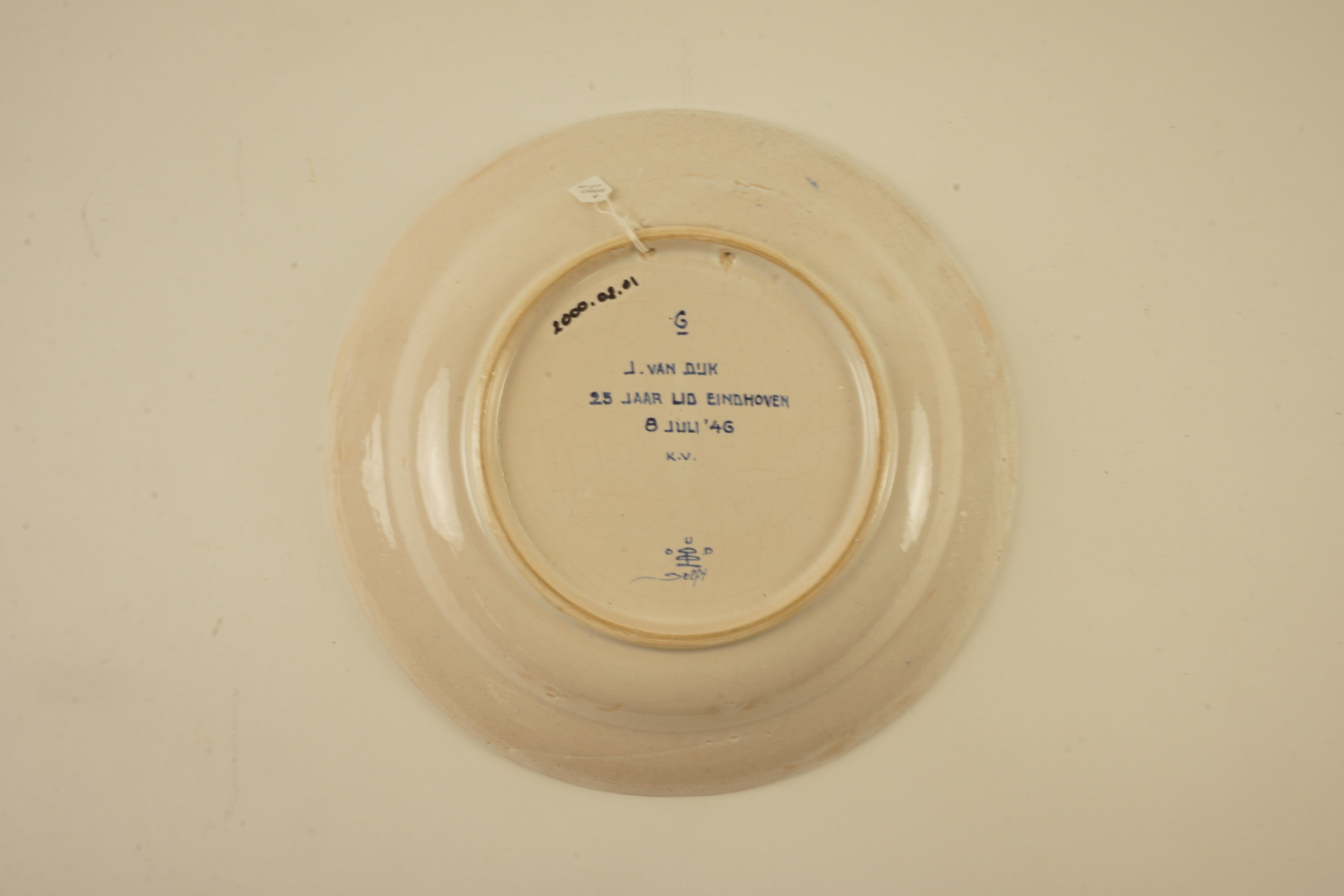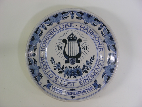 gemonogrammeerd a.z.: K.V. (= Karel Vermeeren). Gemerkt a.z.: O U D Delft met boom (= Oude Delft te Nijmegen). Opschrift: Koninklijke Harmonie 'Apollo's Lust' Eindhoven, voor verdiensten 1841, op a.z.: G.J. van Dijk 25 jaar lid Eindhoven 8 juli '46. n.b.: Jan/Joan van Dijk * 3 februari 1901 te Best + 4 januari 1969 te ...