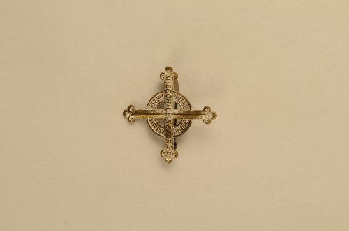 Draagspeld Onthouding Katholieke Vrouwen, verzilverd messing, een kruisvormige speld (vorm grieks kruis) met een ring om de kruisarmen, op deze ring en op de horizontale kruisbalk het opschrift ‘ONTHOUDING DOOR DE NEDERL. KATHOL. VROUWEN’, met veiligheidsspeld op a.z., 3 x 3 x 0,6 cm