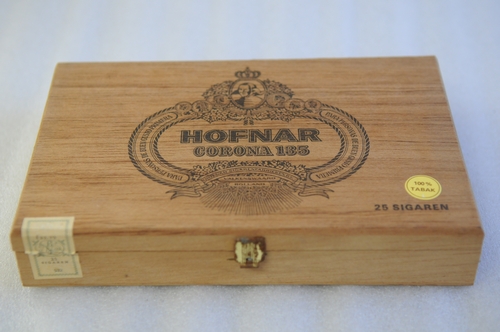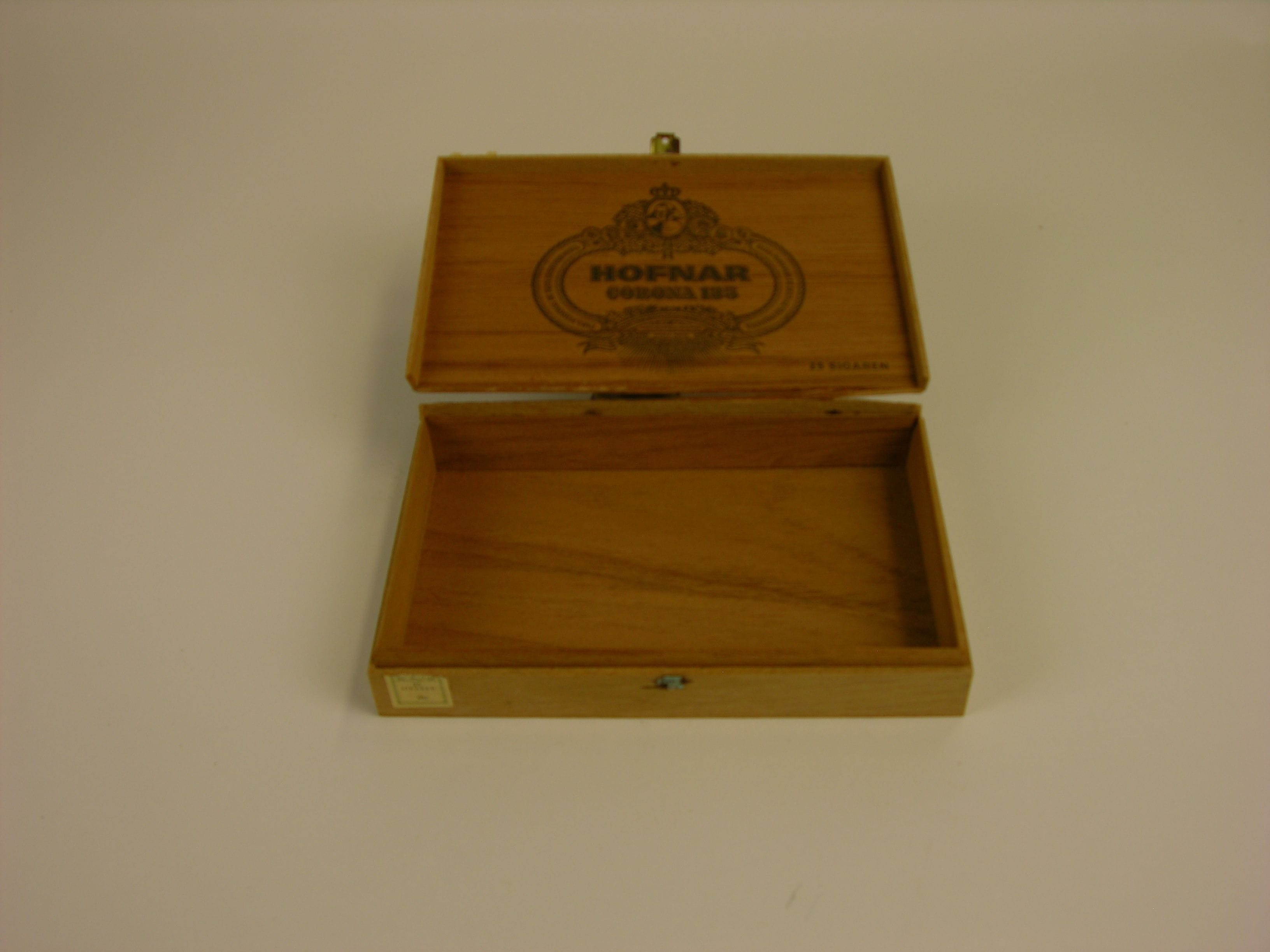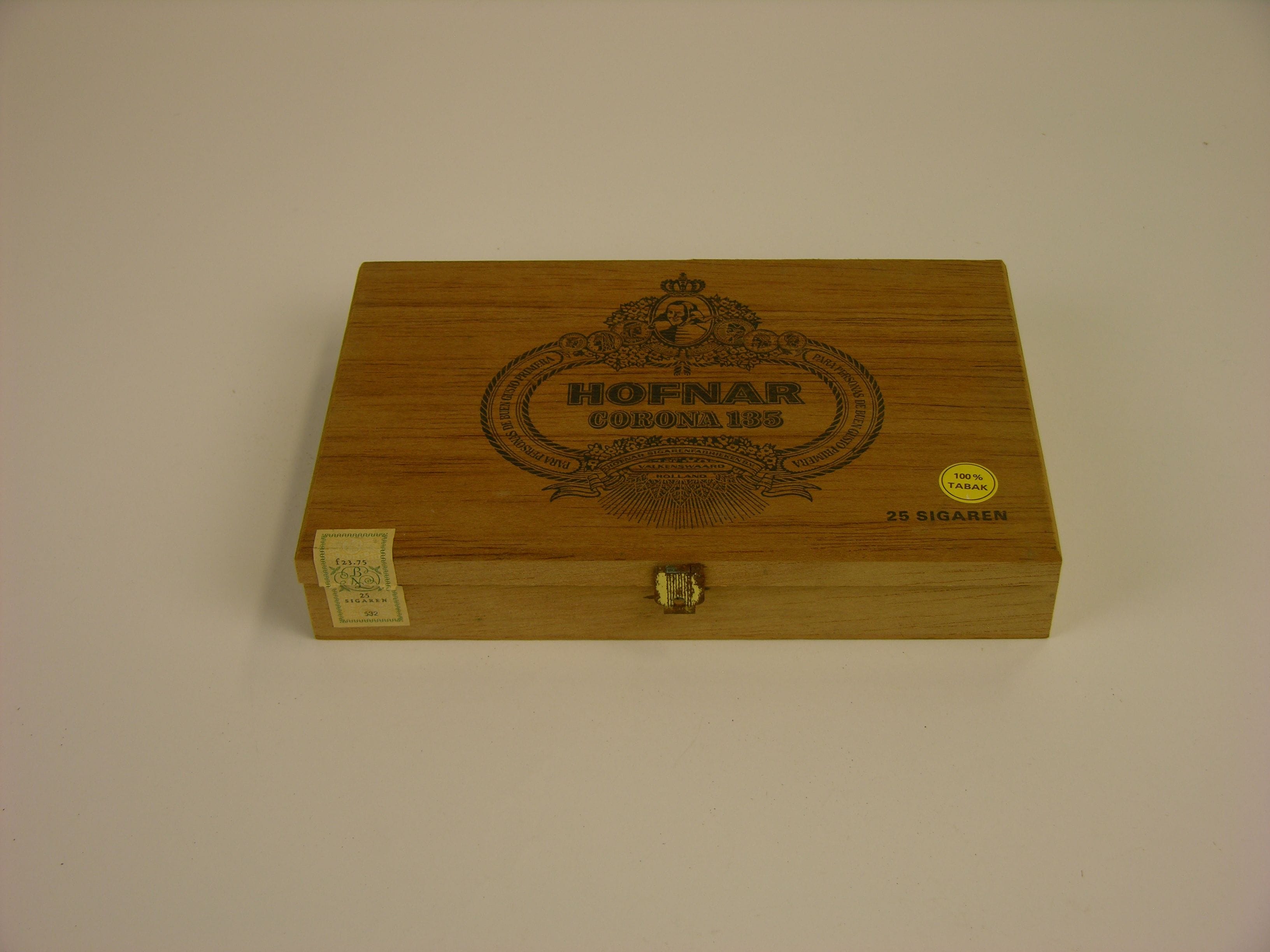 Sigarenkistje 'Hofnar Corona 135' - 4e kwart van de 20e eeuw, materiaal: hout en ijzer, afmetingen: 4 x 23 x 14,5 cm, sigarenkistje met de dekselopdruk 'Hofnar corona 135' en (2x, links en rechts) 'Para personas de buen gusto primera', voor 25 sigaren