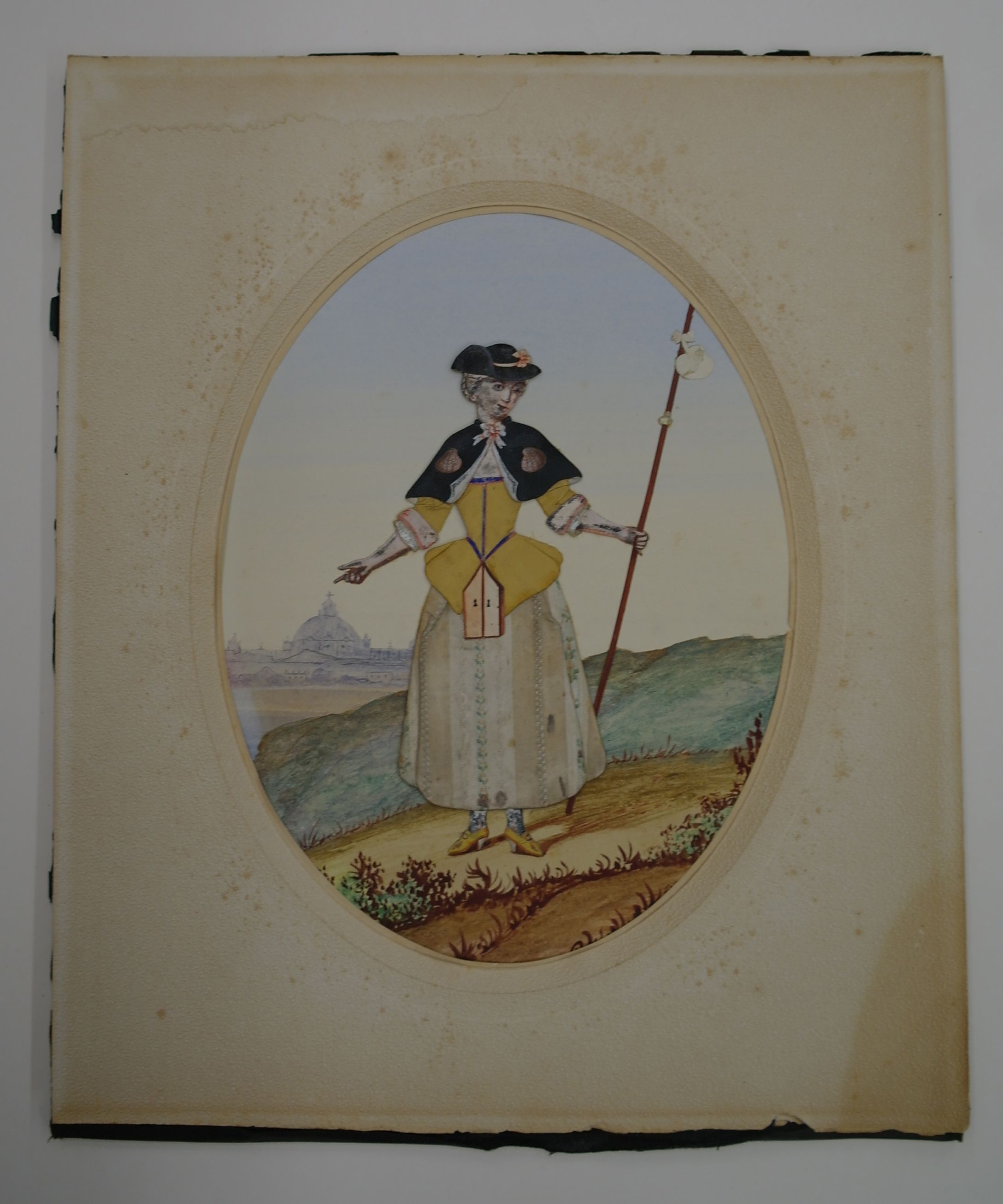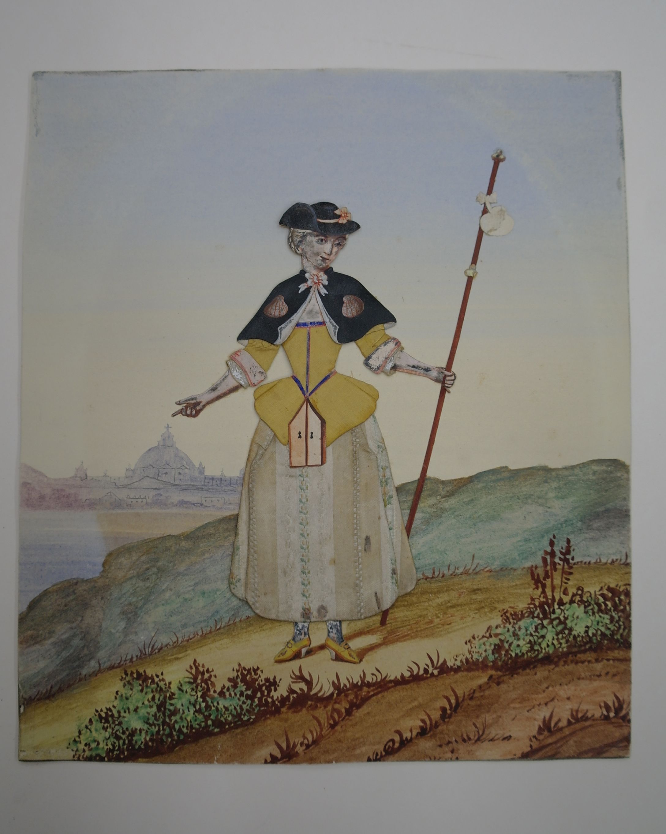 Pelgrimerende vrouw in heuvellandschap met koepelkerk op de achtergrond (St. Pieter te Rome ?)