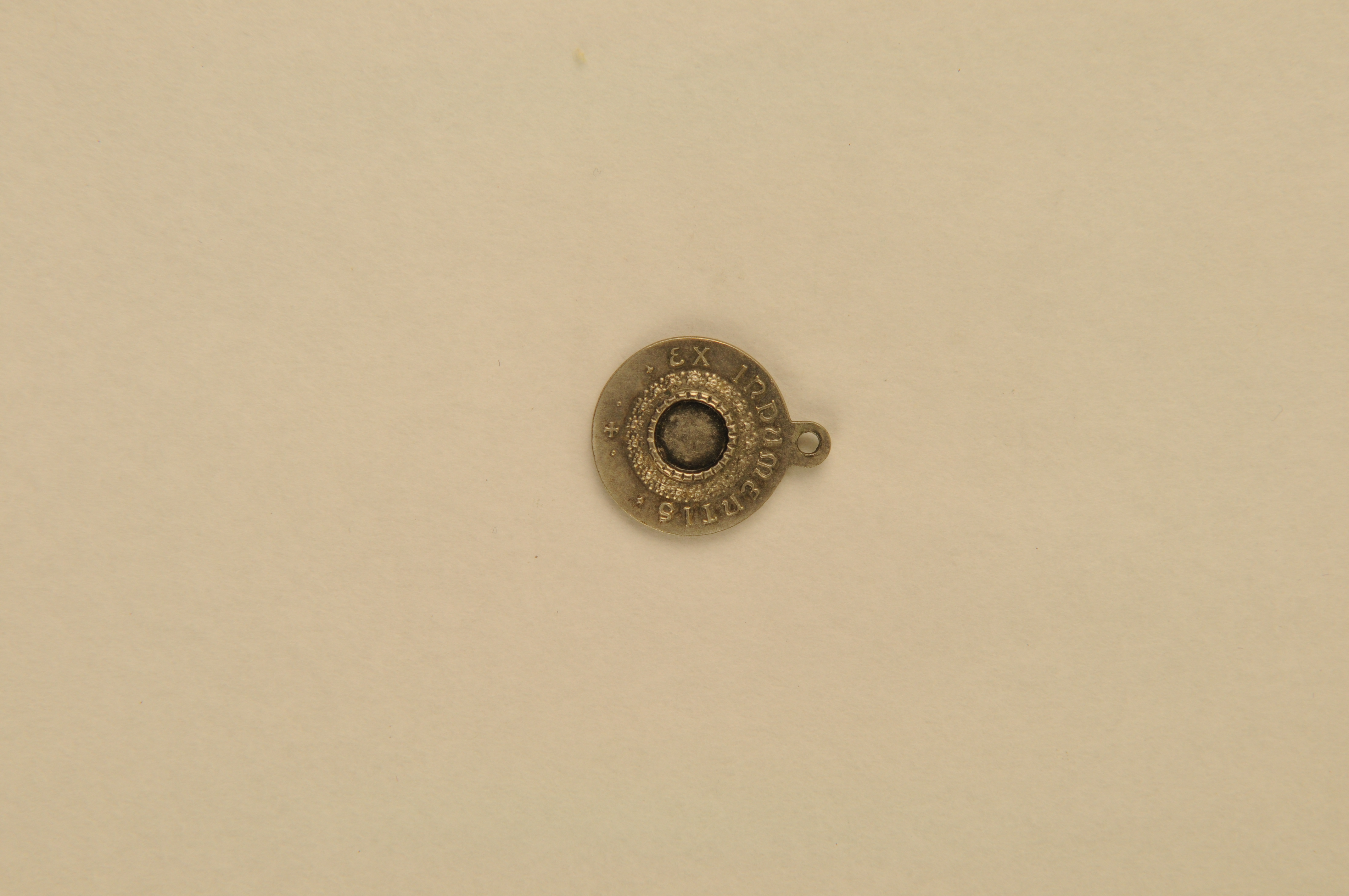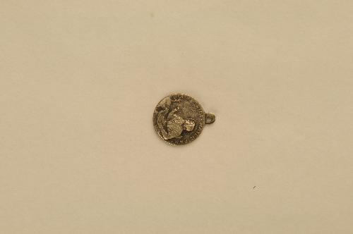 Religieuze medaille/draagpenning, materiaal: metaal (verzilverd), een ronde penning met op vz. reliëfafbeelding de Zalige Anna Maria Taigi en randschrift ‘B.A.M. TAIGI MATER FAM.’ en op kz. verzinking voor inleg (een relikwie ?) en randschrift ‘EX INDUMENTIS’, 2 x 1,3 x 0,1 cm