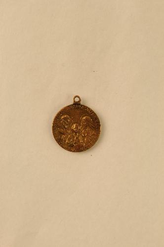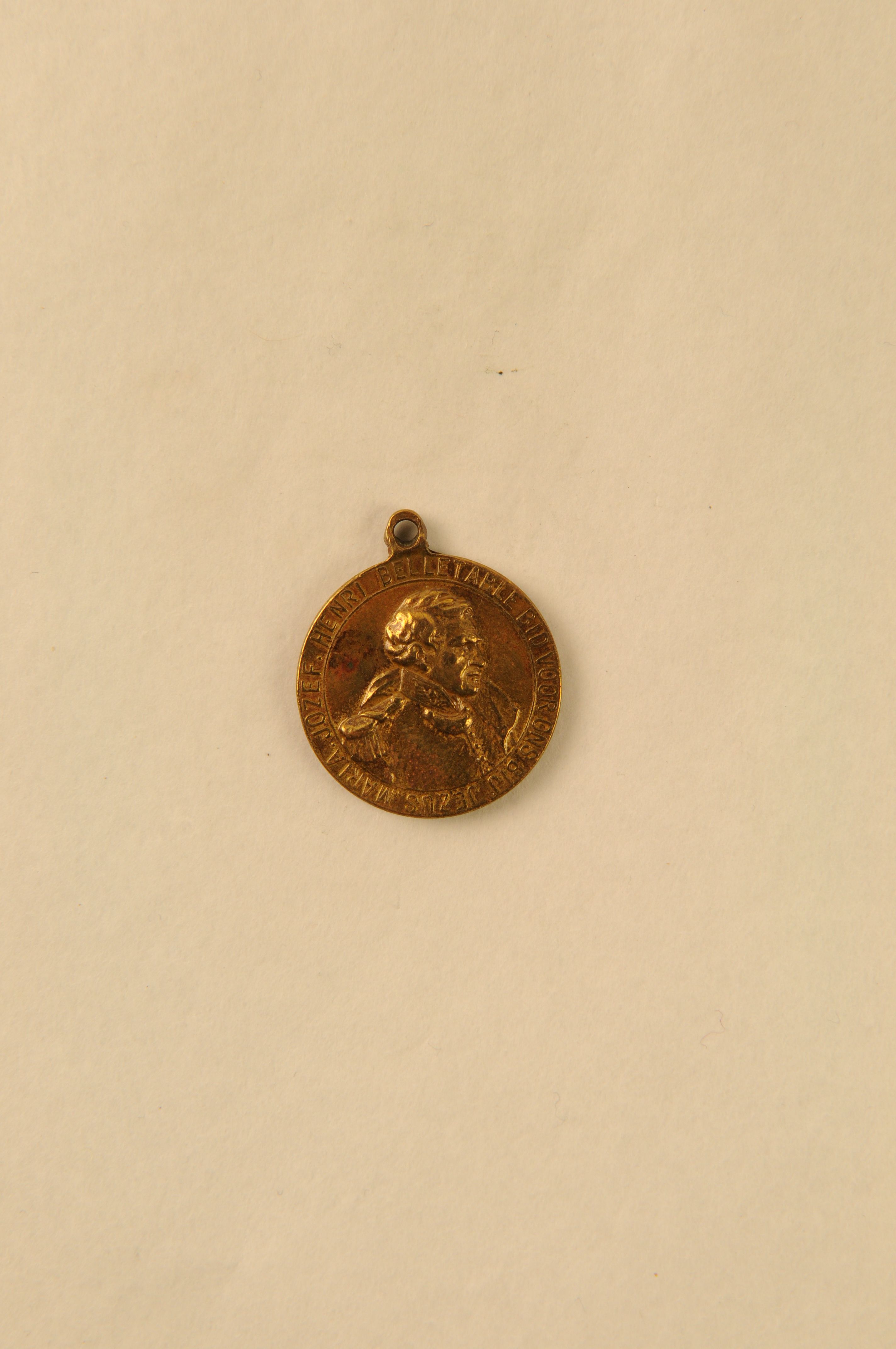 Religieuze medaille/draagpenning, materiaal: messing, vz.portret van Henri Belletable in 19e eeuws officiersuniform met randschrift: ‘HENRI BELLETABLE BID VOOR ONS BIJ JEZUS. MARIA. JOZEF., kz. De Heilige Familie met randschrift ‘JEZUS. MARIA. JOZEF. REDT ONS. ZEGENT ONS. HEILIGT ONS, 2,7 x 2,2 cm