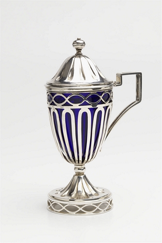 Mosterdpot – ca. 1800, zilver/blauw glas, hoogte 15,3 cm, doorsnede 6,2 cm, gemerkt stadskeur 3 hoorntjes in schildje, zespuntige ster met kroon, meesterteken P.R.