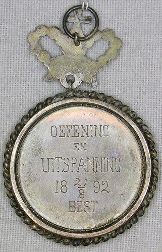 Prijspenning handboogvereniging - 1891, metaal/verzilverd, diameter 45 mm, dikte 6 mm, vz.: '3de prijs', kz.: 'OEFENING EN UITSPANNING 18 21/8 91 BEST', prijspenning Oefening en Uitspanning Best, met kroontje