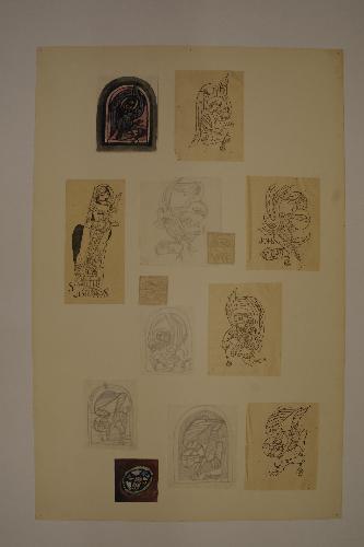 blad met acht ontwerpen (en vijf afbeeldingen uit tijdschriften) voor glas-in-loodramen met de levende wezens/evangelisten; H. Gerardus Majellakerk Eindhoven in passe-partout