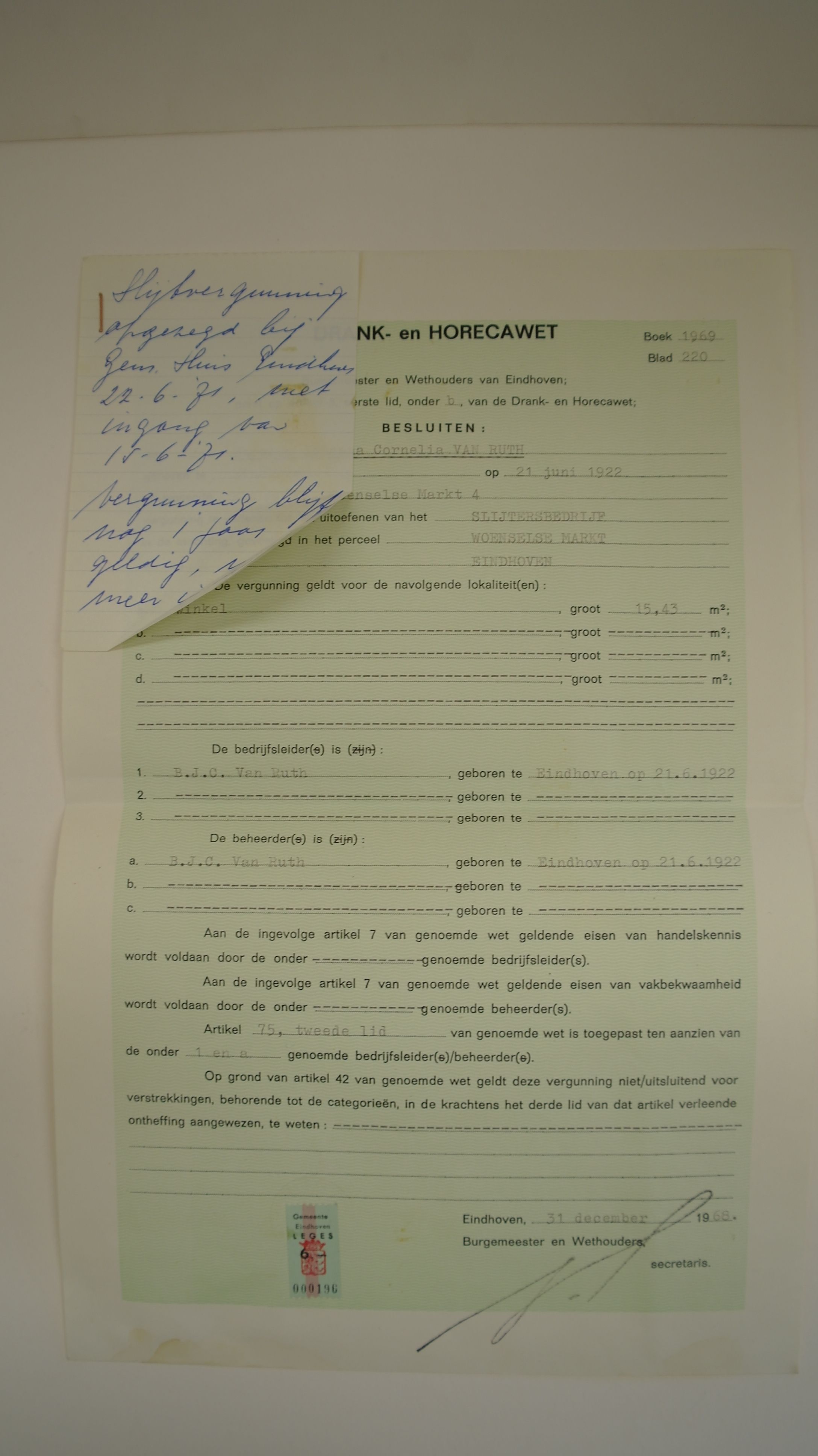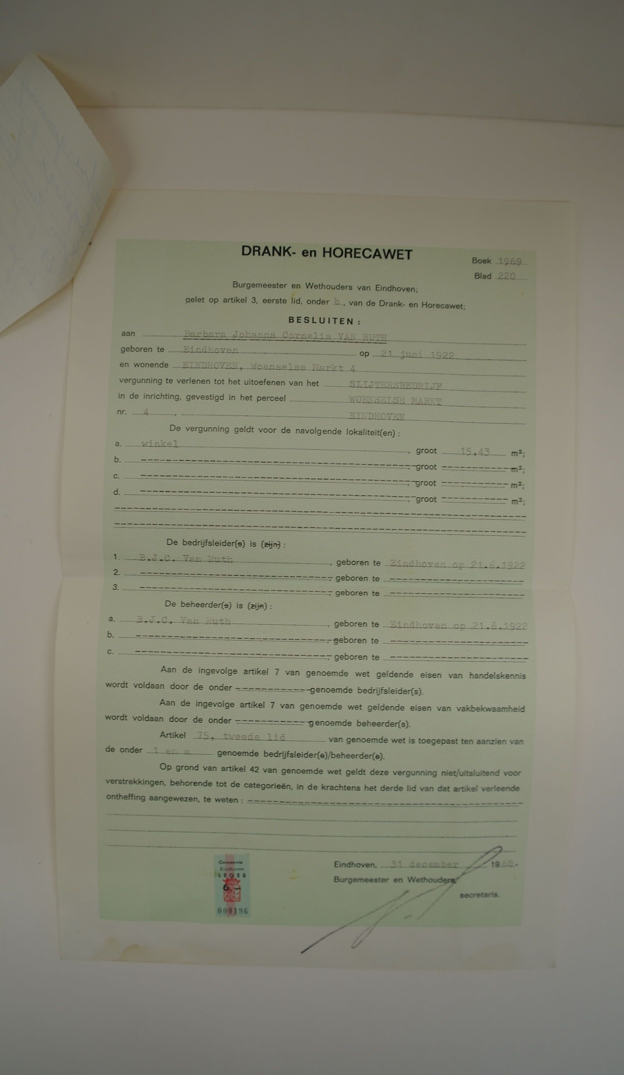 Vergunning tot het uitoefenen van een slijterijbedrijf verleend aan Barbara Johanna Cornelia Van Ruth op 31.12.1968.