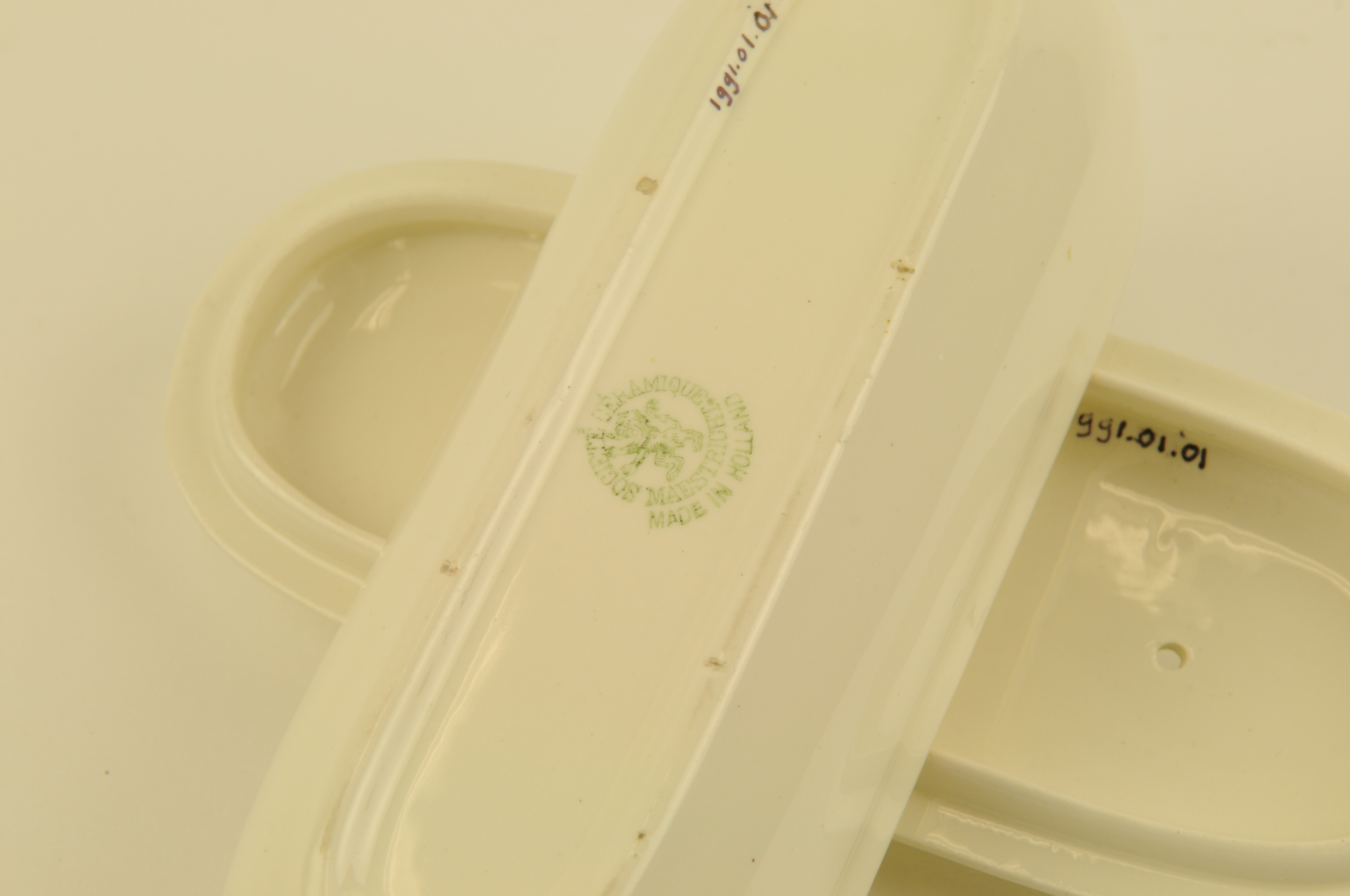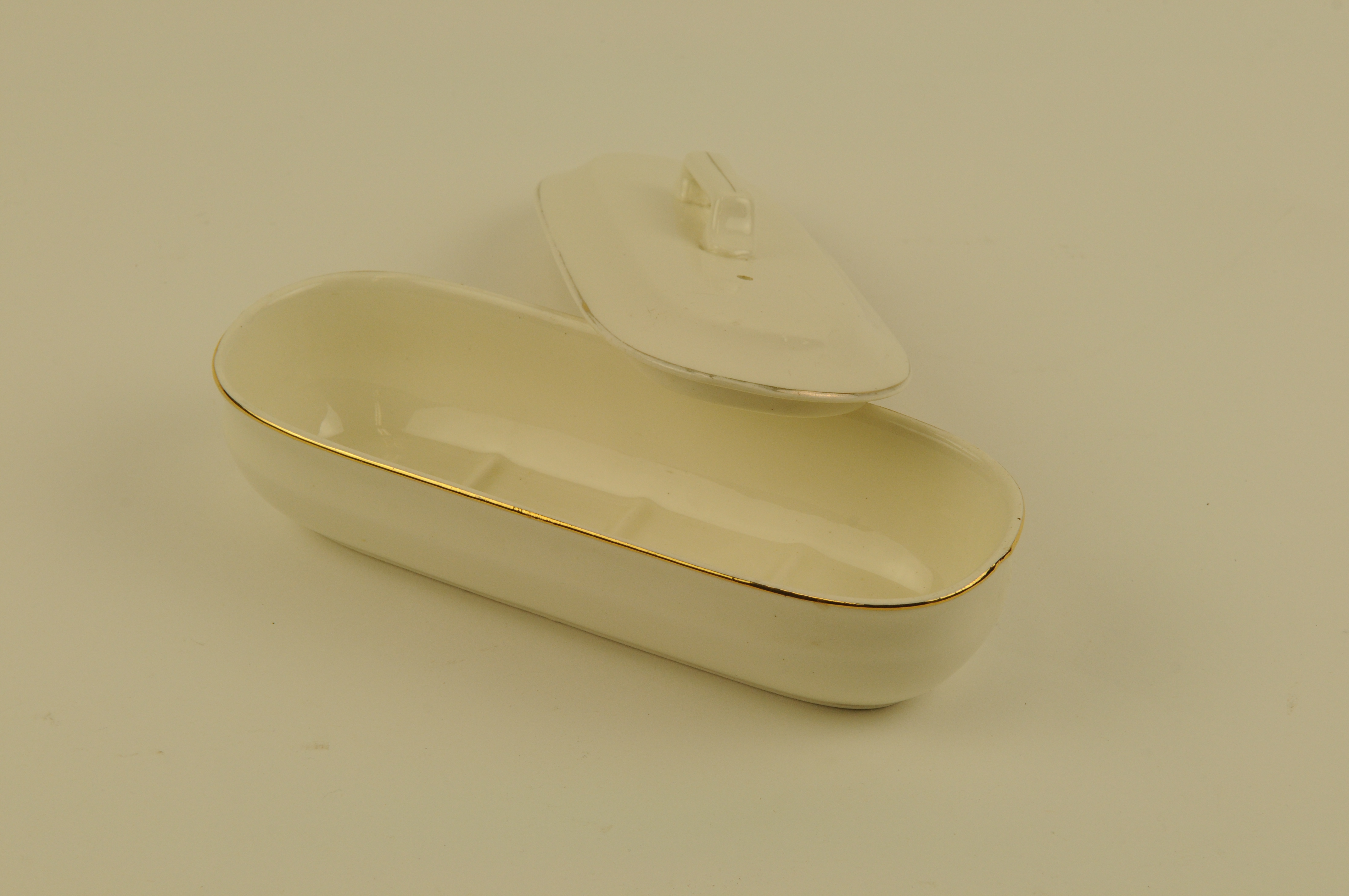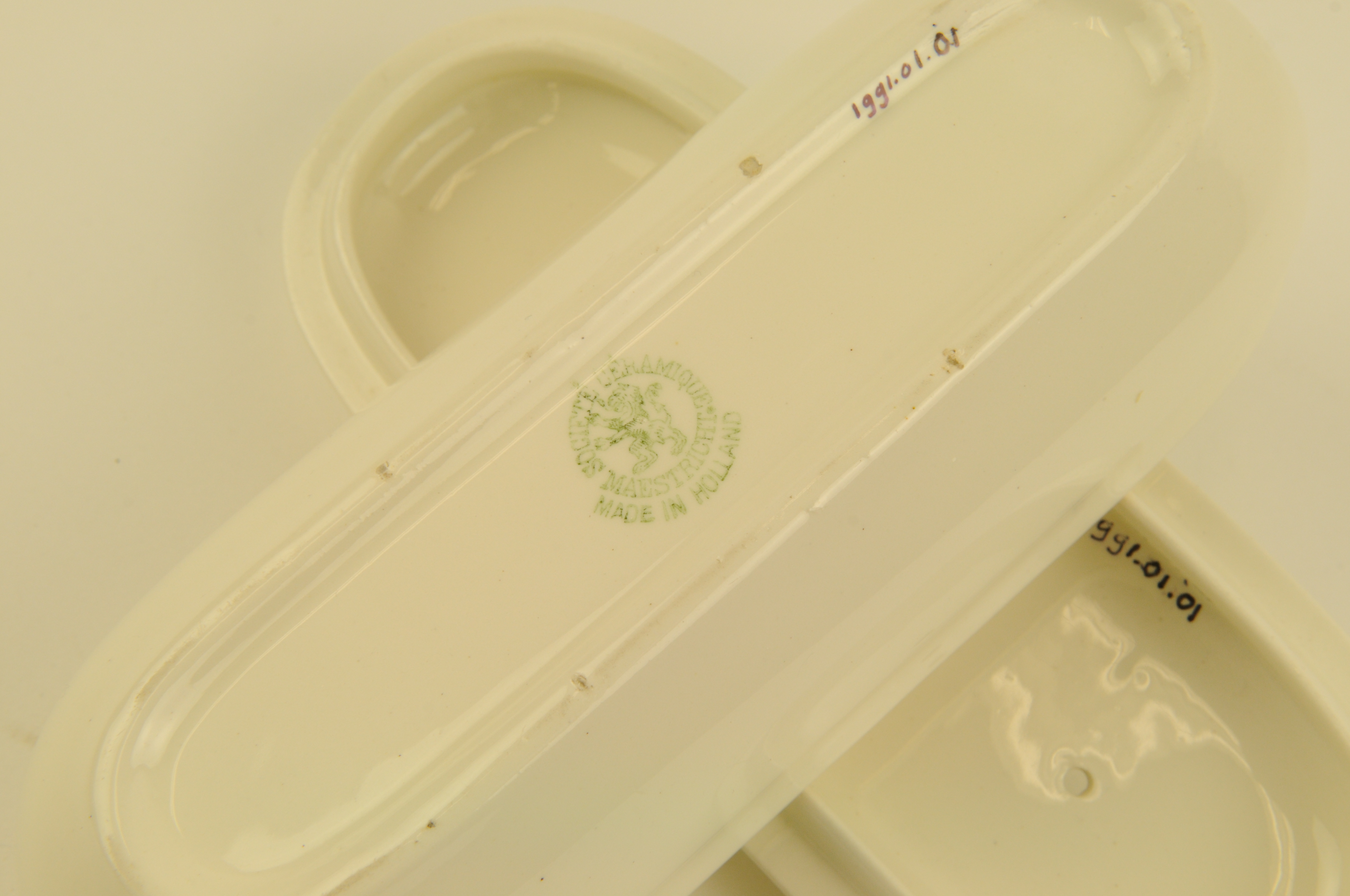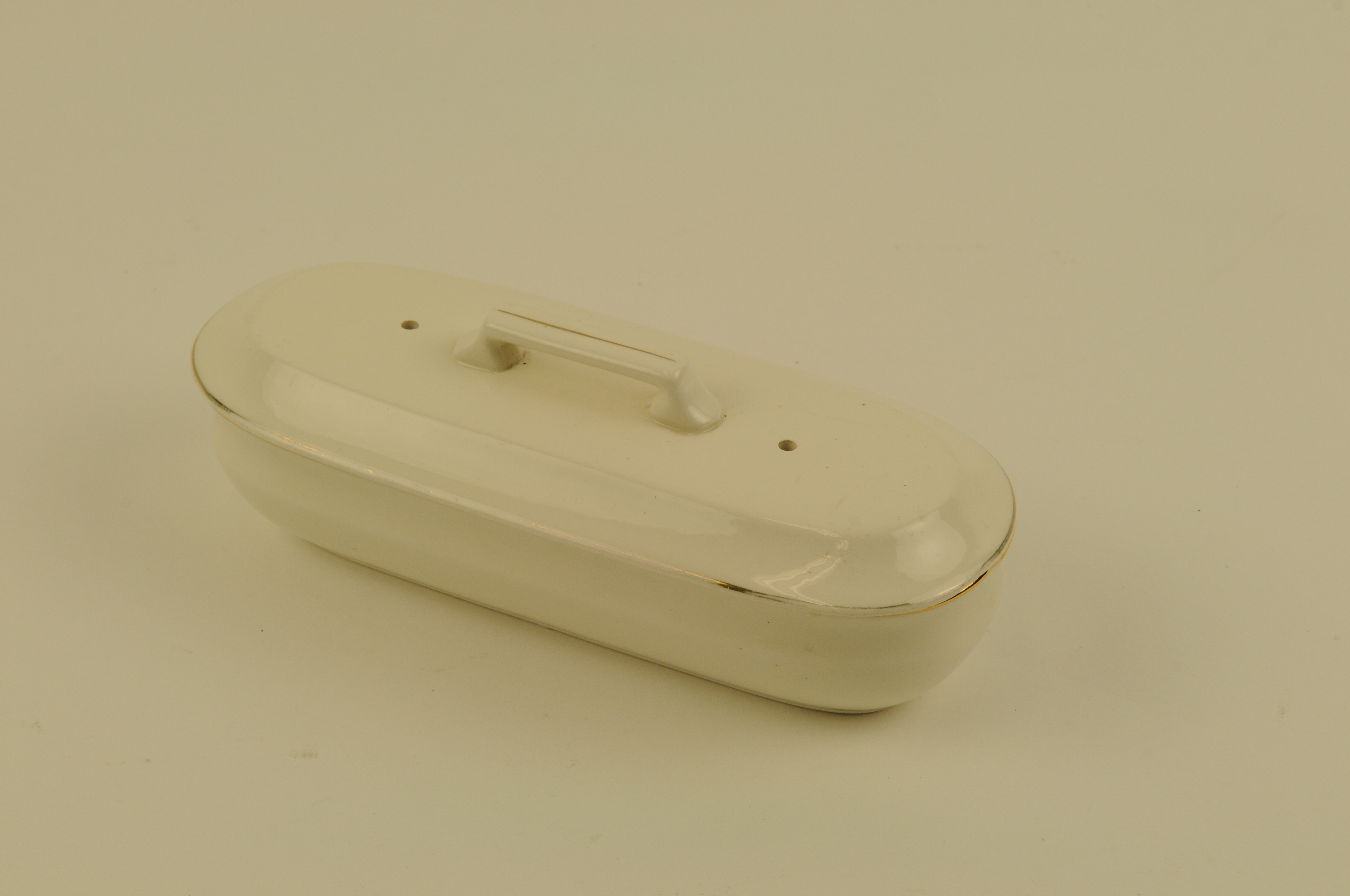 Lampetschaaltje - 1e helft van de 20e eeuw, witbakkend geglazuurd aardewerk, afmetingen: 7,5 x 8,5 x 21 cm, een langwerpig aardewerken schaaltje met deksel en greep, bovenin twee gaatjes, op de onderzijde van de bodem het stempel: 'SOCIETE CERAMIQUE MAESTRICHT'