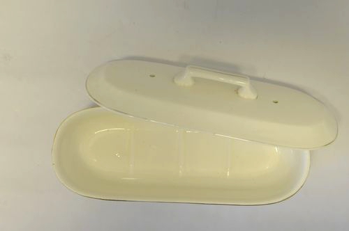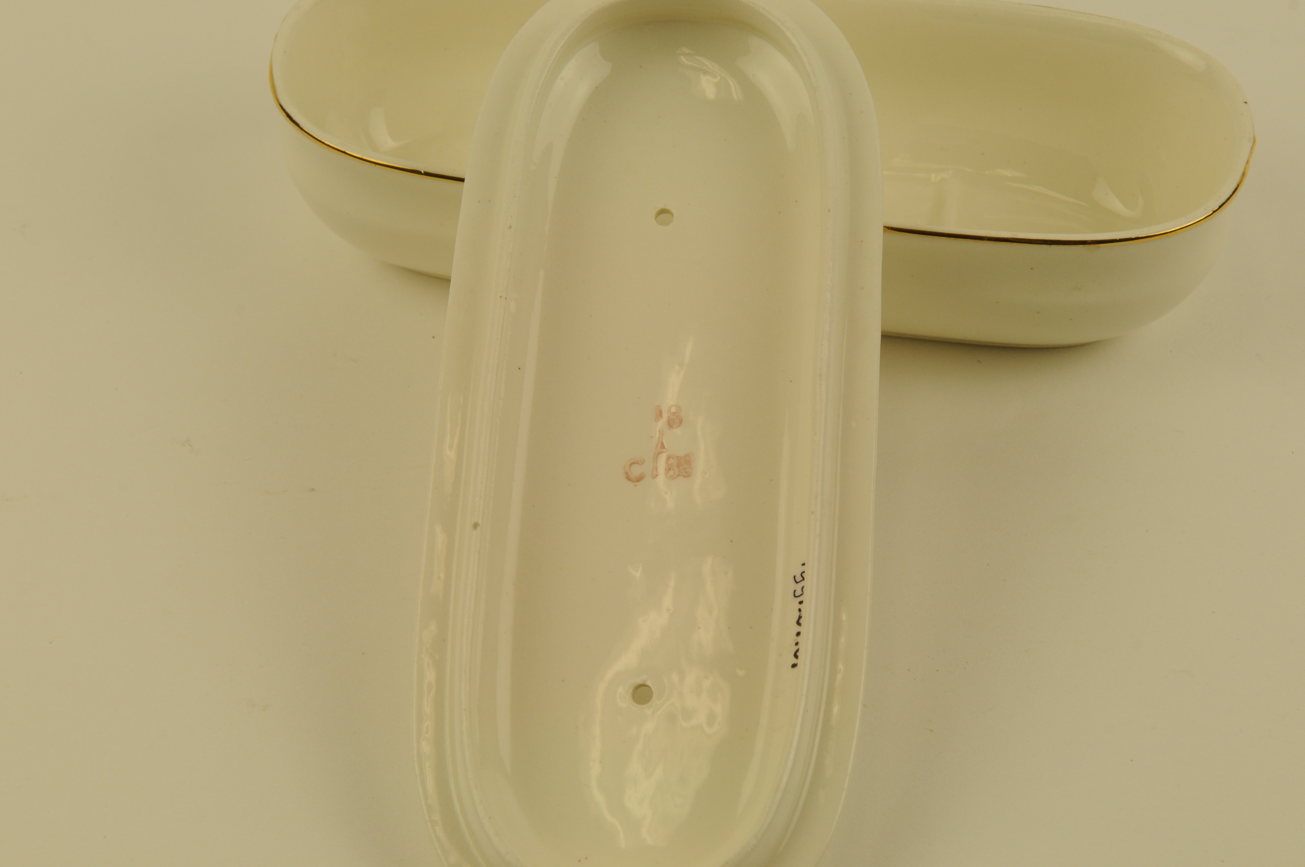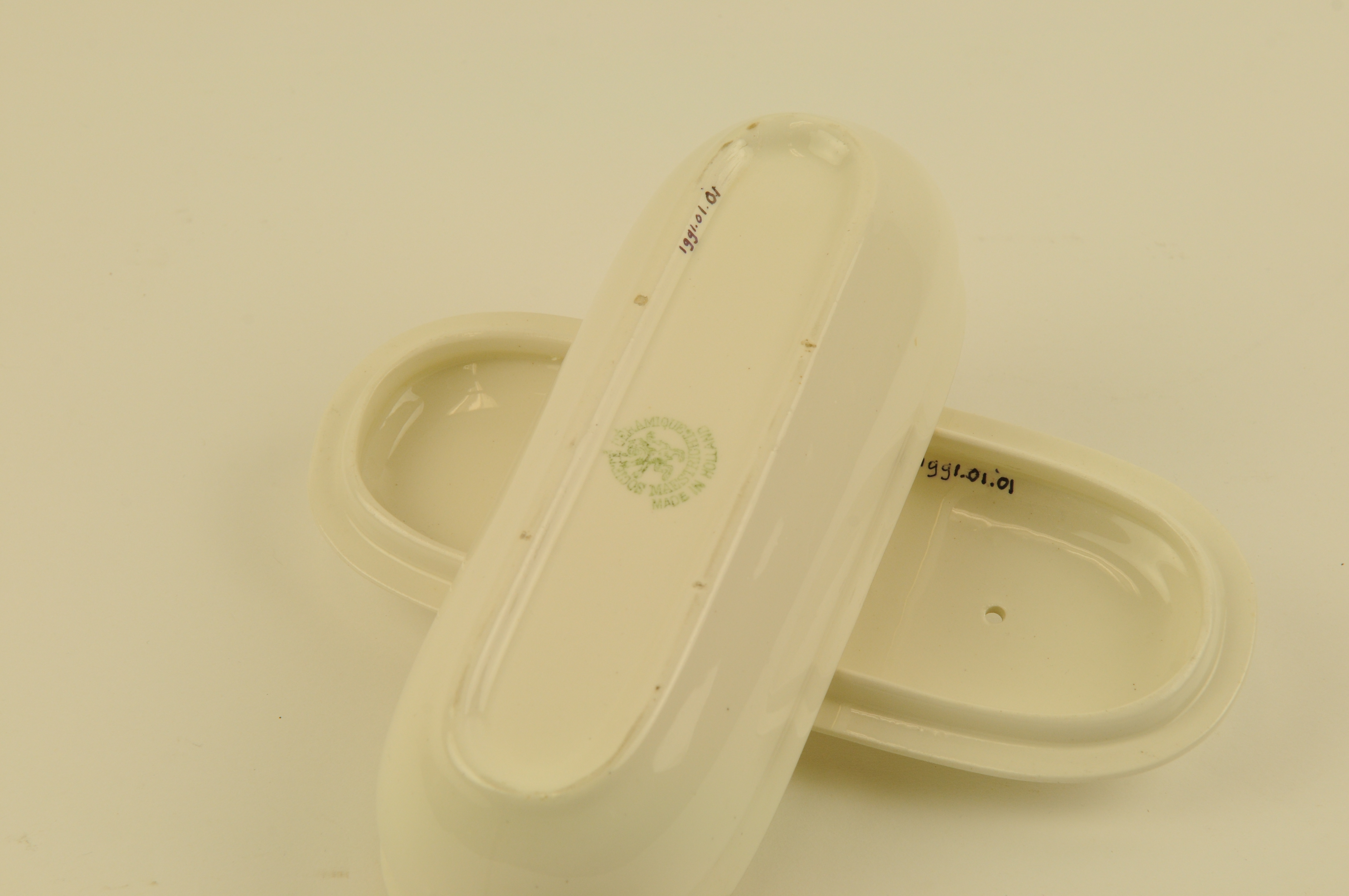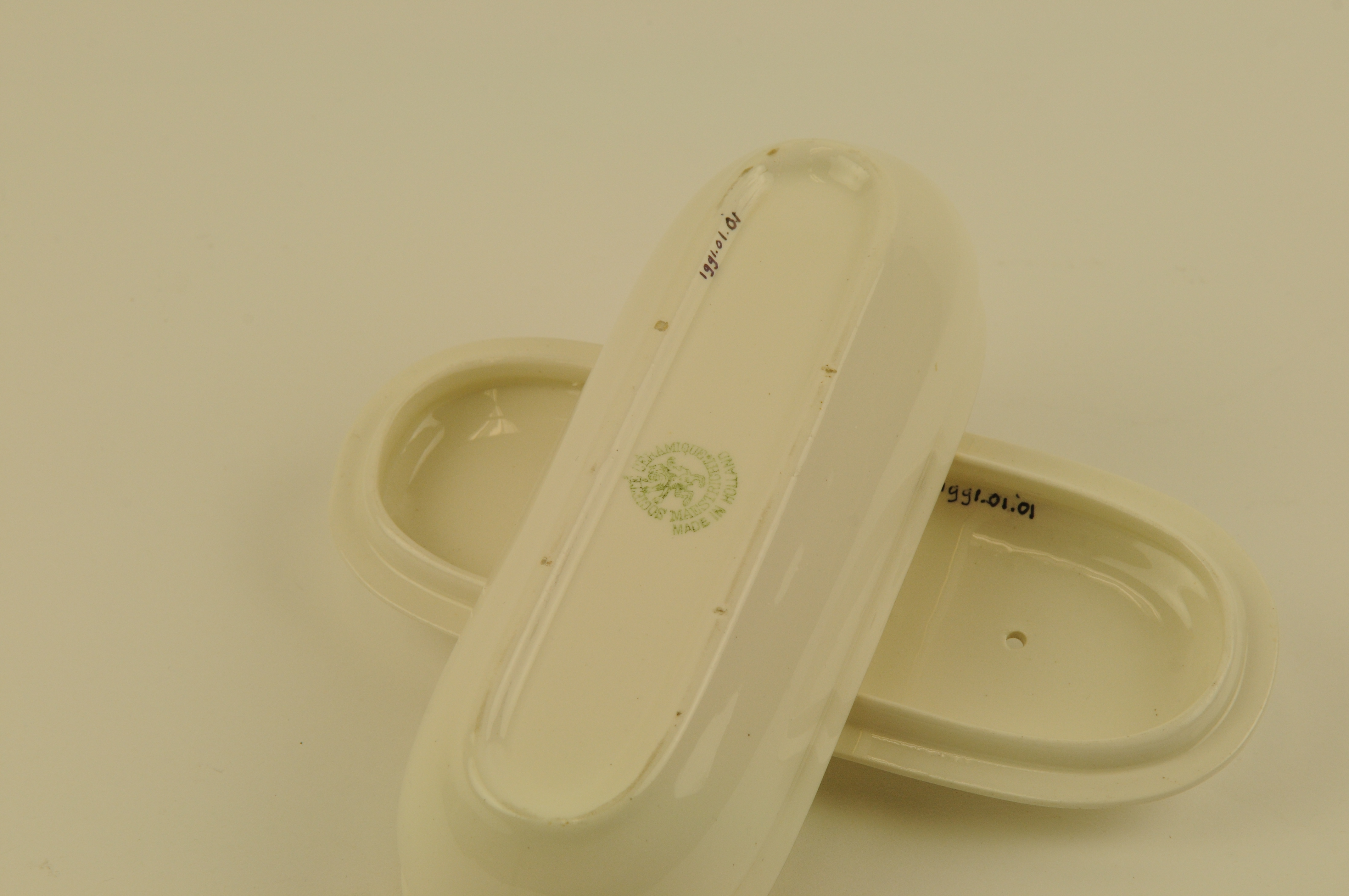 Lampetschaaltje - 1e helft van de 20e eeuw, witbakkend geglazuurd aardewerk, afmetingen: 7,5 x 8,5 x 21 cm, een langwerpig aardewerken schaaltje met deksel en greep, bovenin twee gaatjes, op de onderzijde van de bodem het stempel: 'SOCIETE CERAMIQUE MAESTRICHT'