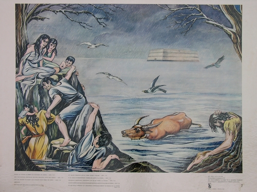 Schoolplaat met titel: ' Zondvloed' , kleurenlithografie/papier/karton, tekening/ontwerp: Ben Horsthuis, uitgave: St. Gregoriushuis, Utrecht, druk: Missiehuis Steyl, serie Bellarminus Bijbelplaten nr. 7, gesigneerd r.o.: Ben Horsthuis, onder voorstelling het opschrift: Hoger ven hoger klommen de wateren op aarde (Genesis 7: 19), afmetingen 630 mm x 750 mm app.eccl. Utr. 29-6-1950