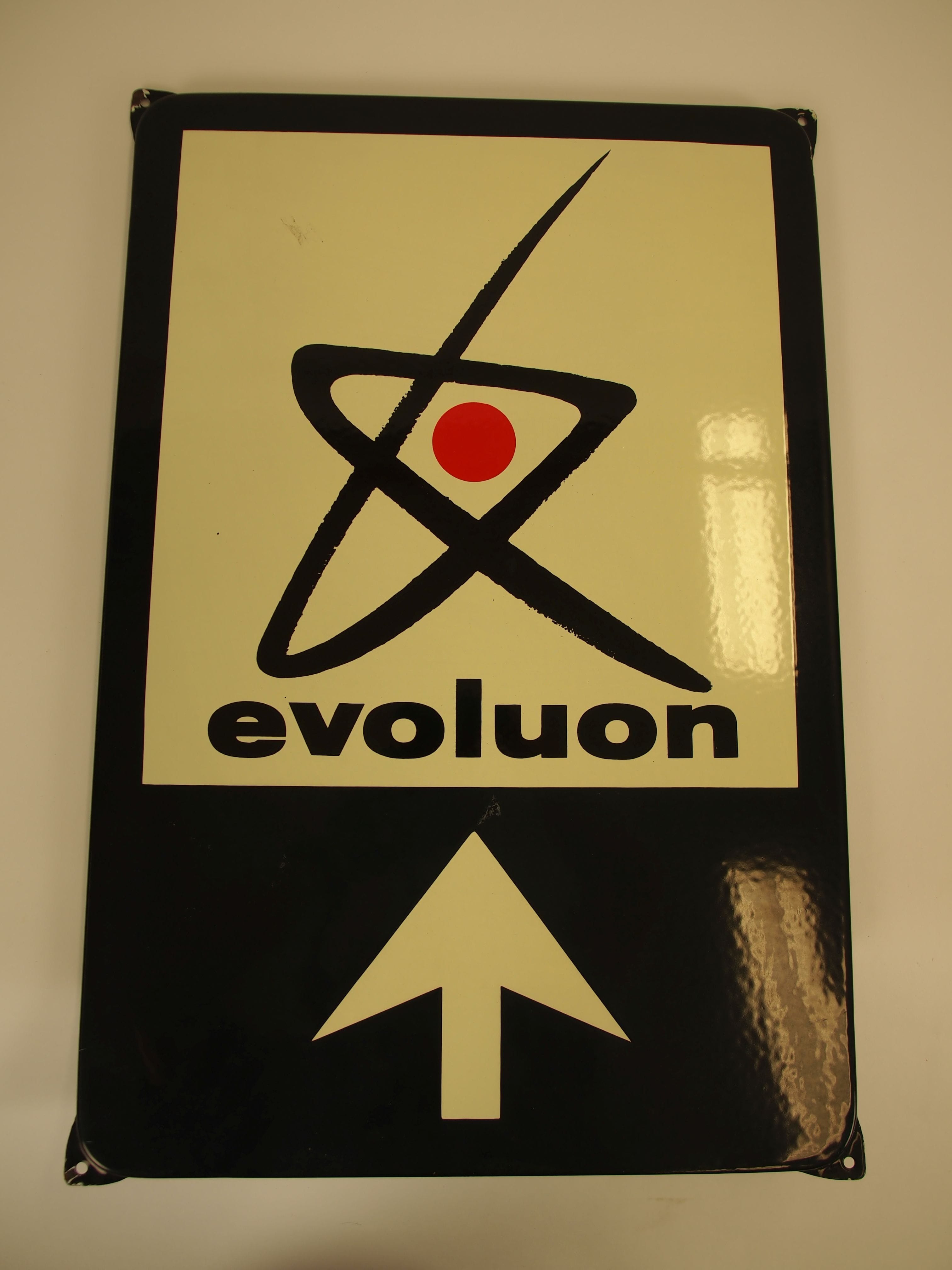 Rechthoekig emaille bord, zwart met witte naar boven wijzende pijl. De pijl wijst naar een wit vlak waarop in zwart Evoluon vermeld staat met erboven een embleem in zwart met rood.