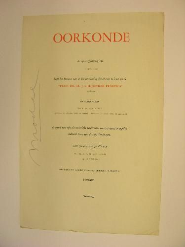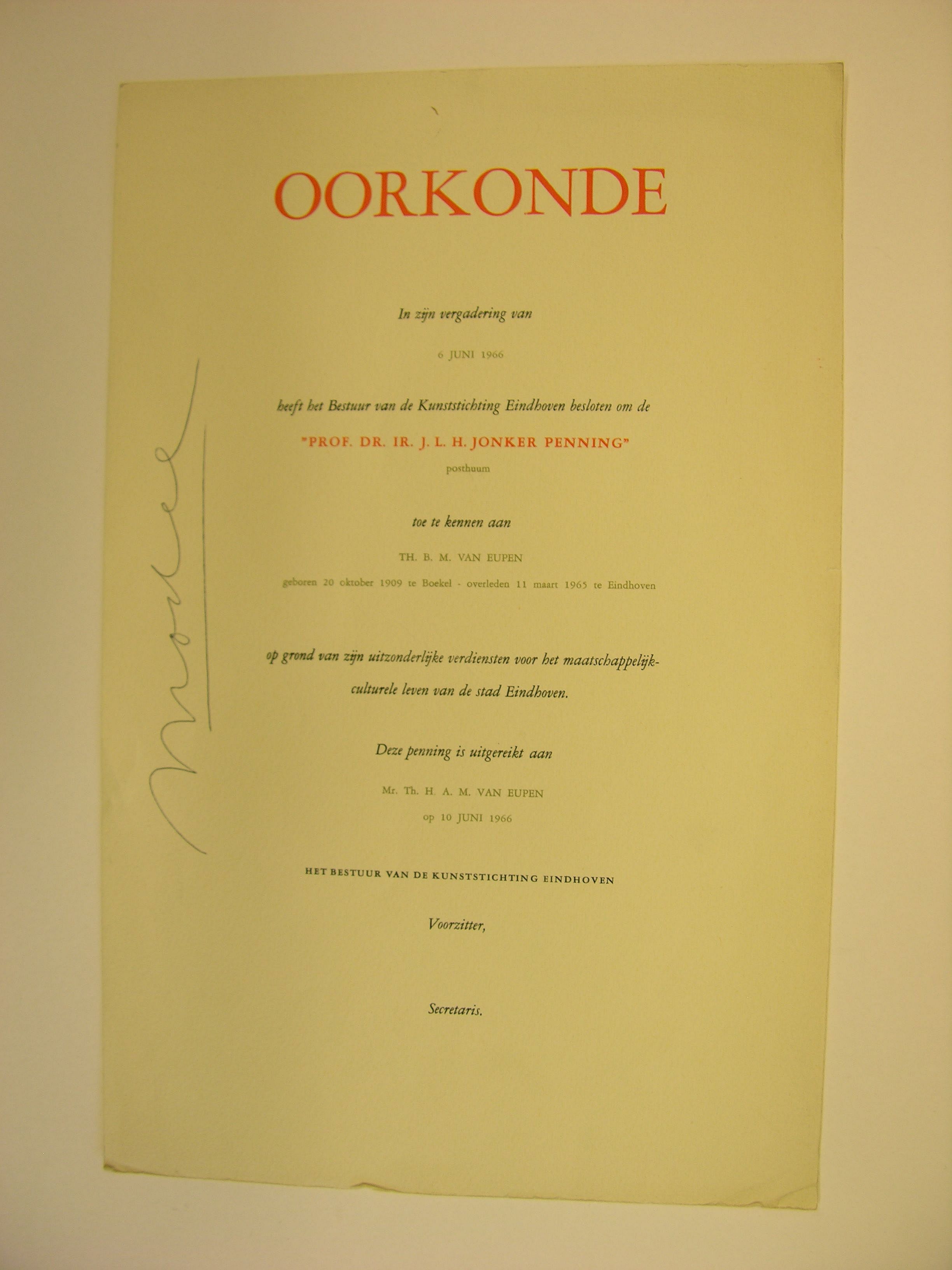 Model van de oorkonde, behorende bij de Prof. dr.ir. J.L.H. Jonker penning, welke uitgereikt werd op grond van uitzonderlijke verdiensten voor het maatschappelijk -culturele leven van de stad Eindhoven. Dit exemplaar behoort bij de penning posthuum toegekend aan Th.B.M. v. Eupen, uitgereikt aan Mr. Th.H.A. v. Eupen