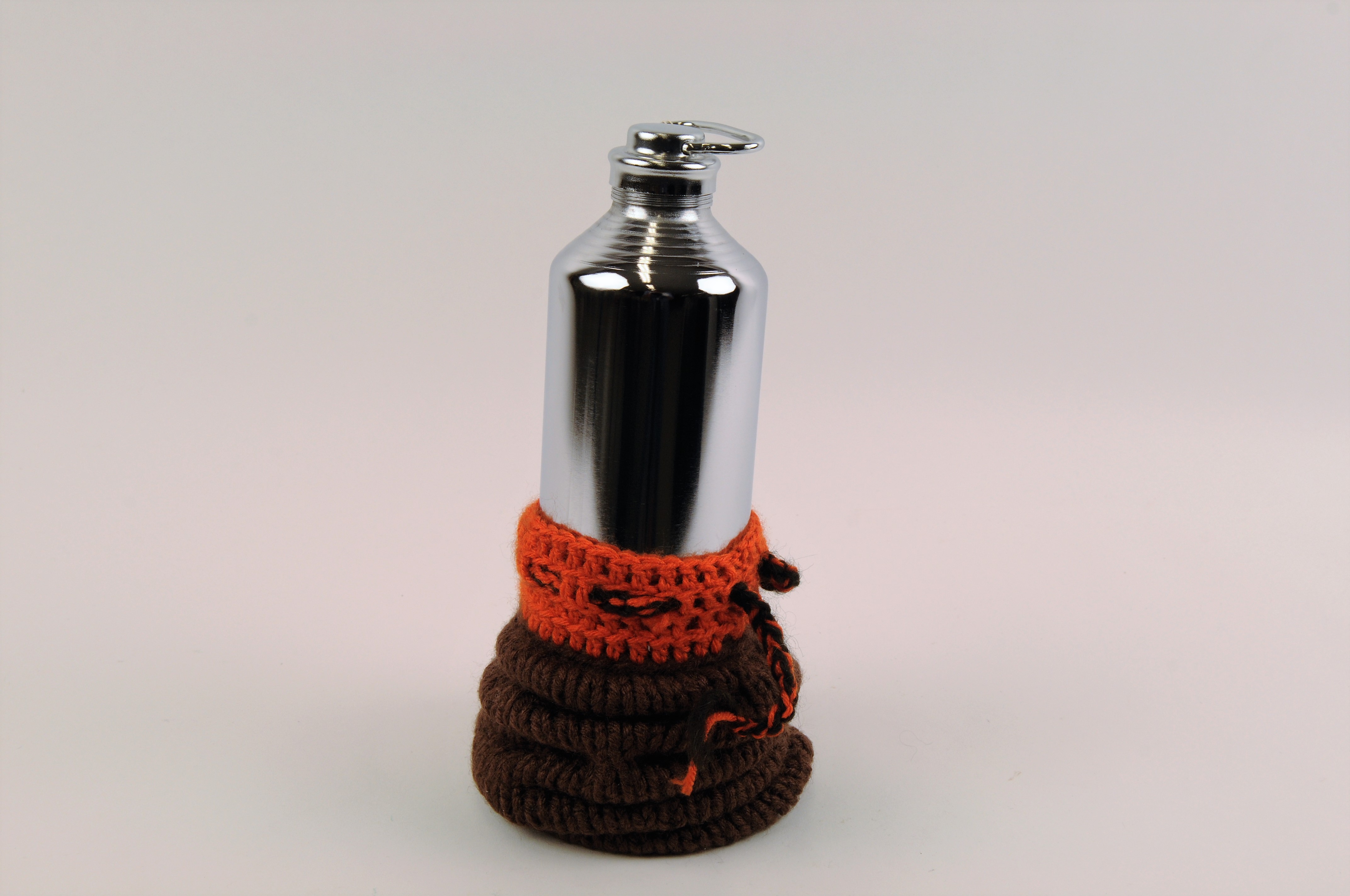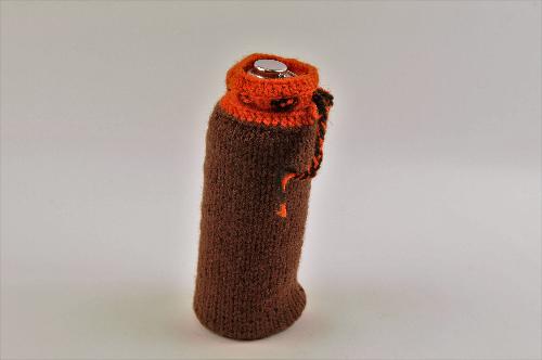 cilindrisch stalen bedkruik met een gebreid omhulsel eromheen
