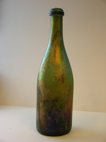 Geiriseerde groen glazen champagnefles, met een diep hart en verdikte flessenmond. gezien de mate van irisatie heeft de fles zich in de bodem (waterput of beerput) bevonden.
