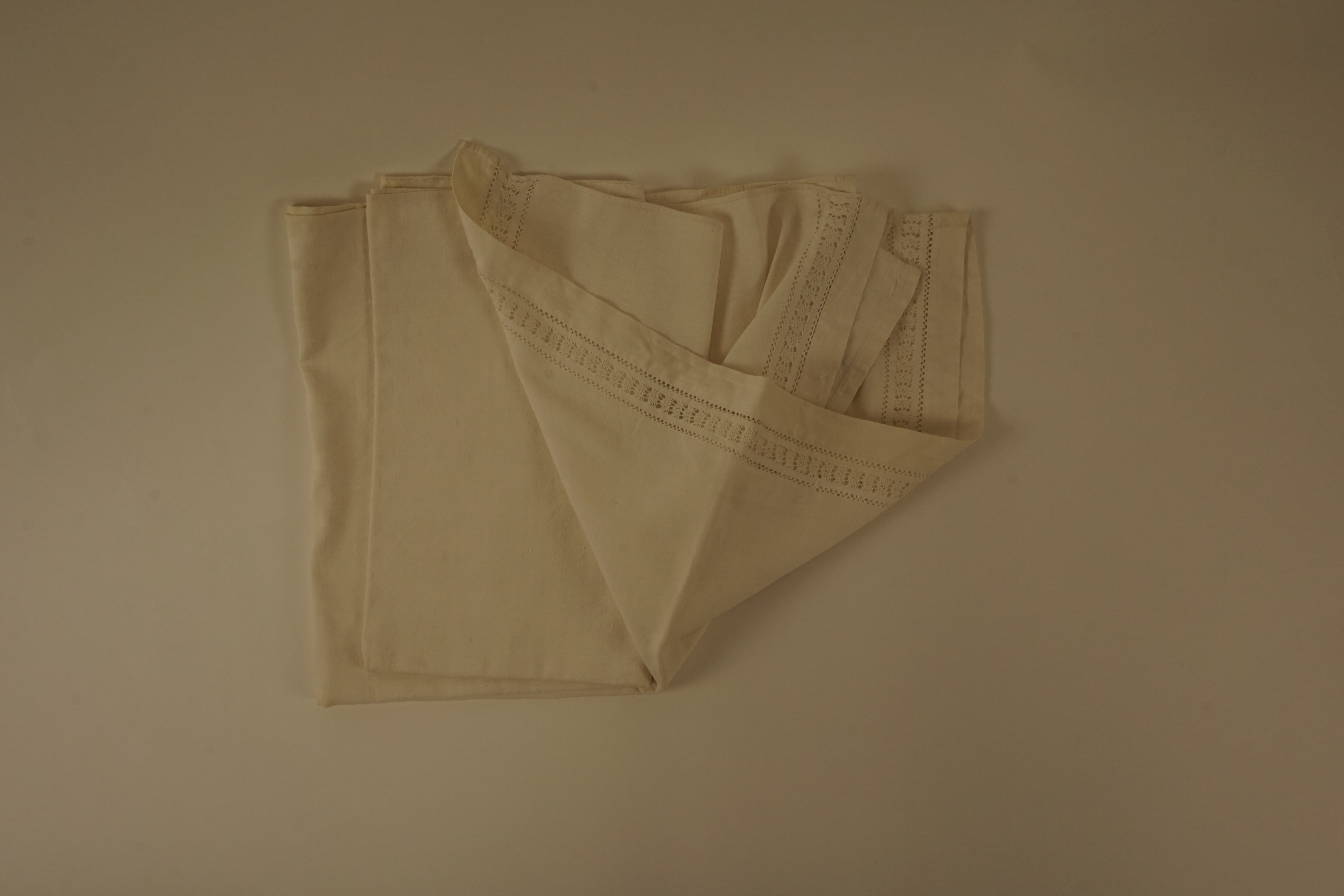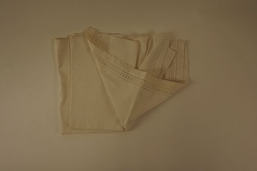 Laken, materiaal: linnen/katoen ?, kleur: wit, lengte 215 cm, breedte 210 cm, opengewerkte zoom en rand, naad in het midden is met de hand genaaid, evenals de zoom