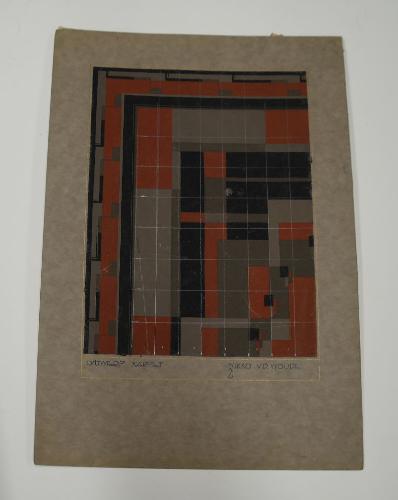 op kartonnen ondergrond geplakt geannnoteerd onder voorstelling l.o.: ontwerp karpet gesigneerd onder voorstelling r.o.: sikko v.d. woude