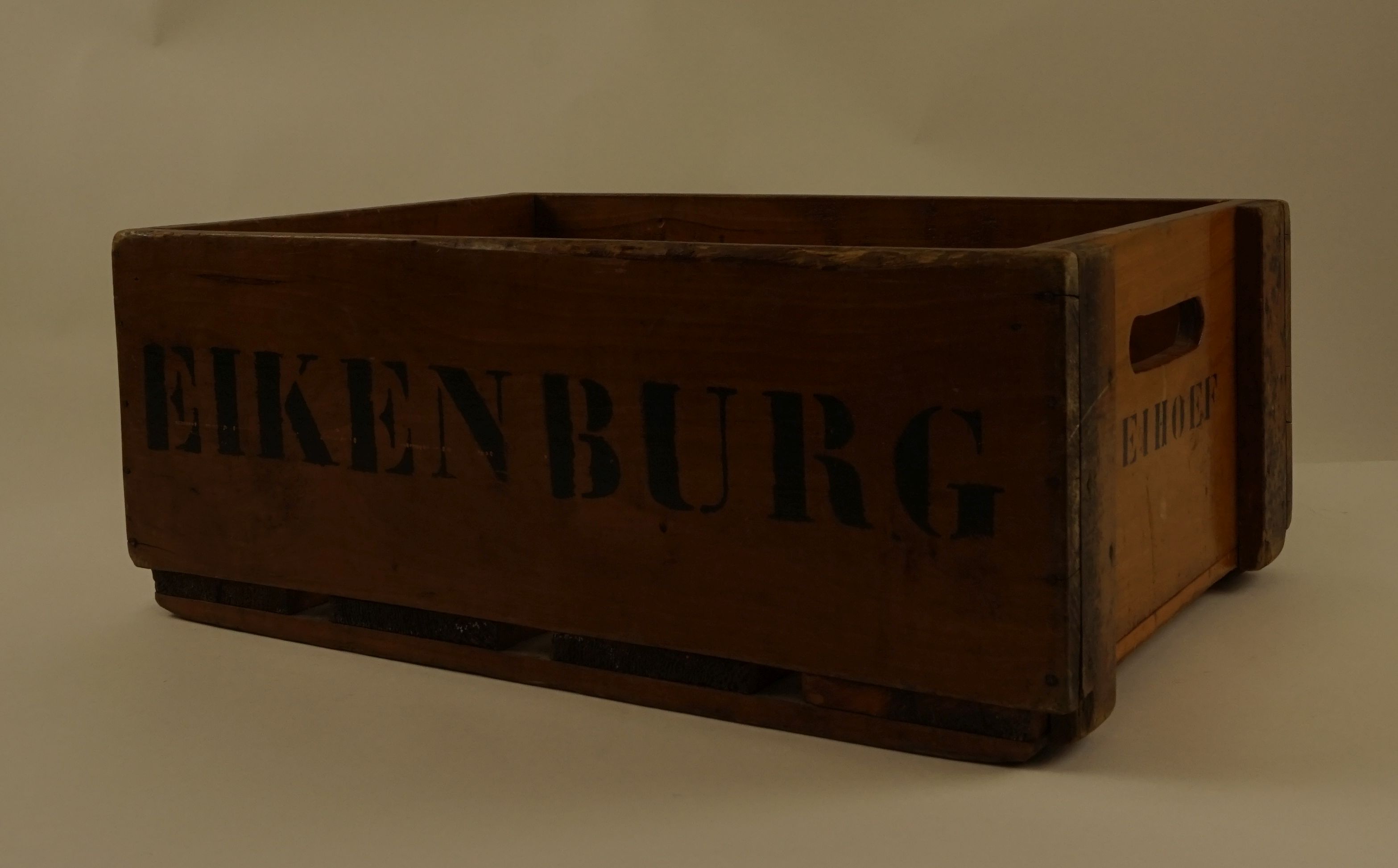 Houten kistje met opschrift 'Eikenburg', 'Pensionaat' en 'Heihoef', gebruikt op het internaat Eikenburg. Het kistje werd gebruikt om fruit te vervoeren vanaf de keuken naar de paviljoens waar de leerlingen verbleven.