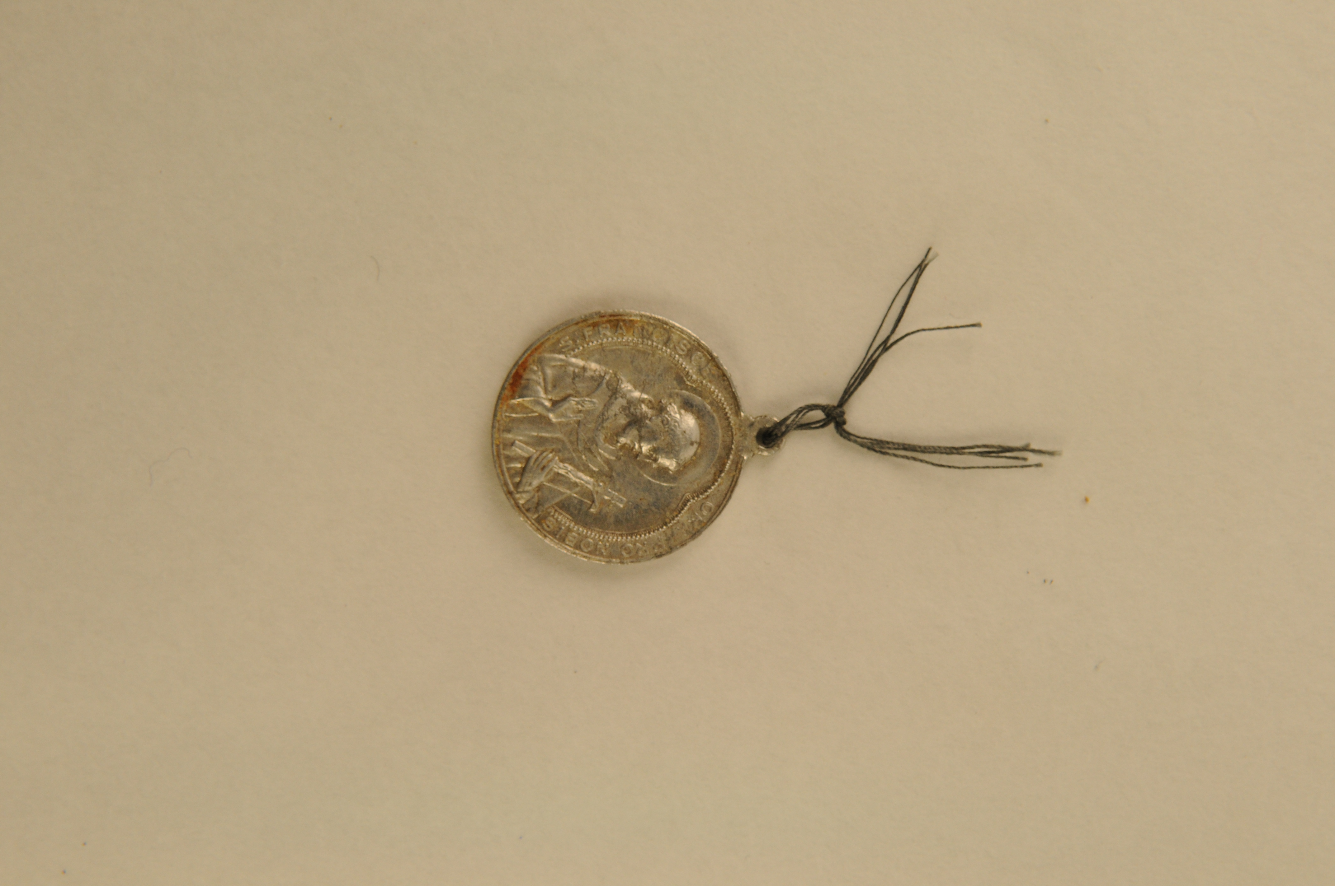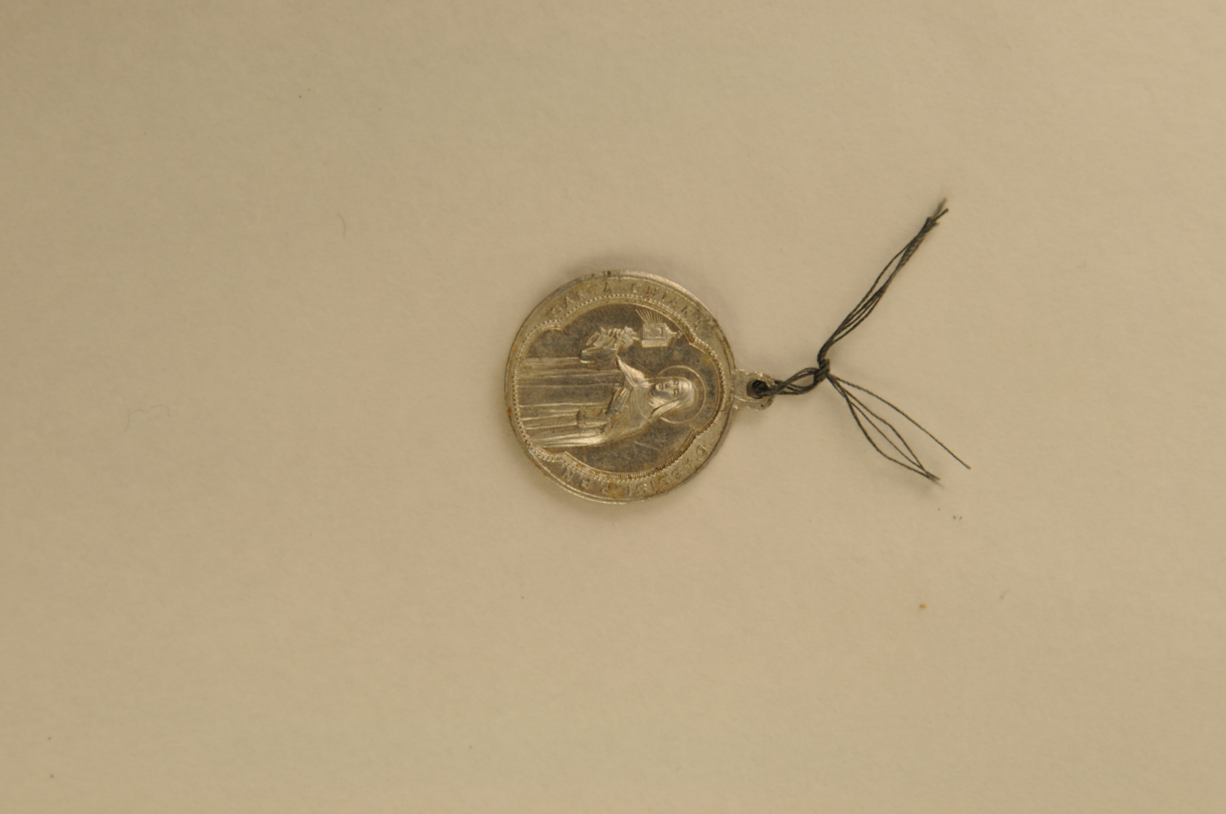 Religieuze medaille/draagpenning, rond, materiaal: aluminium, vz. portret van de H. Franciscus van Assisi met crucifix in vierpas, randschrift ‘S. FRANSISCE ORA PRO NOBIS’, kz. H. Clara met reliekhouder in vierpas en randschrift ‘SANTA CHIARA D’ASSISI O.P.N.’, 3,1 x 2,6 cm