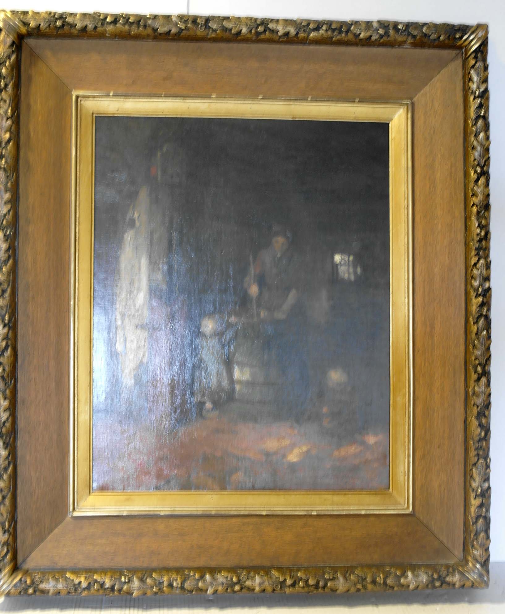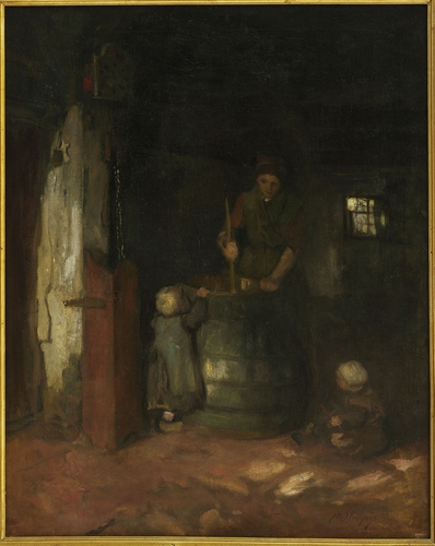 Kempisch interieur met vrouw en kinderen bij karnton – z.j., olieverf/doek, 61 x 50 cm, gesigneerd r.o.: Alb Neuhuys