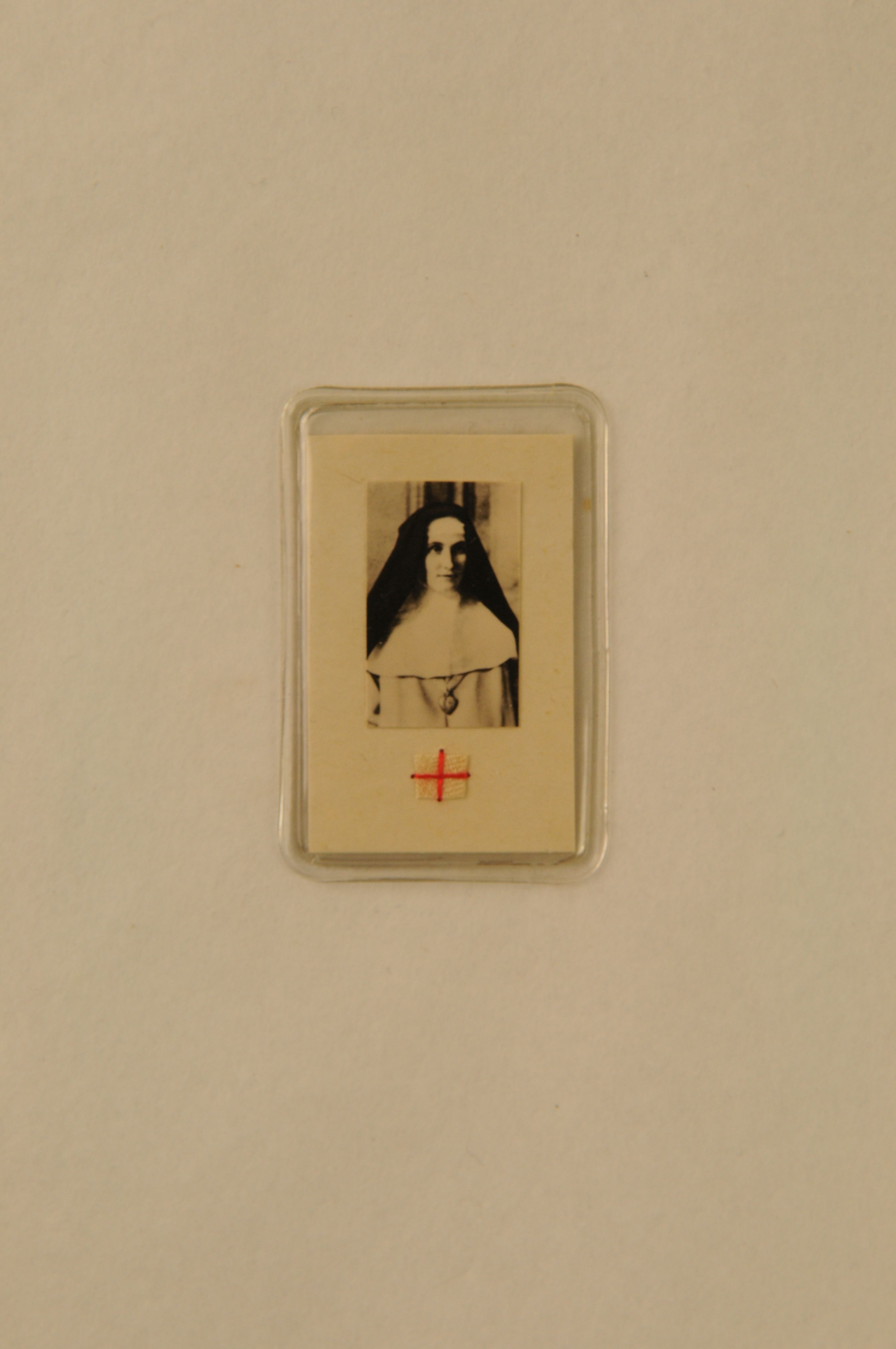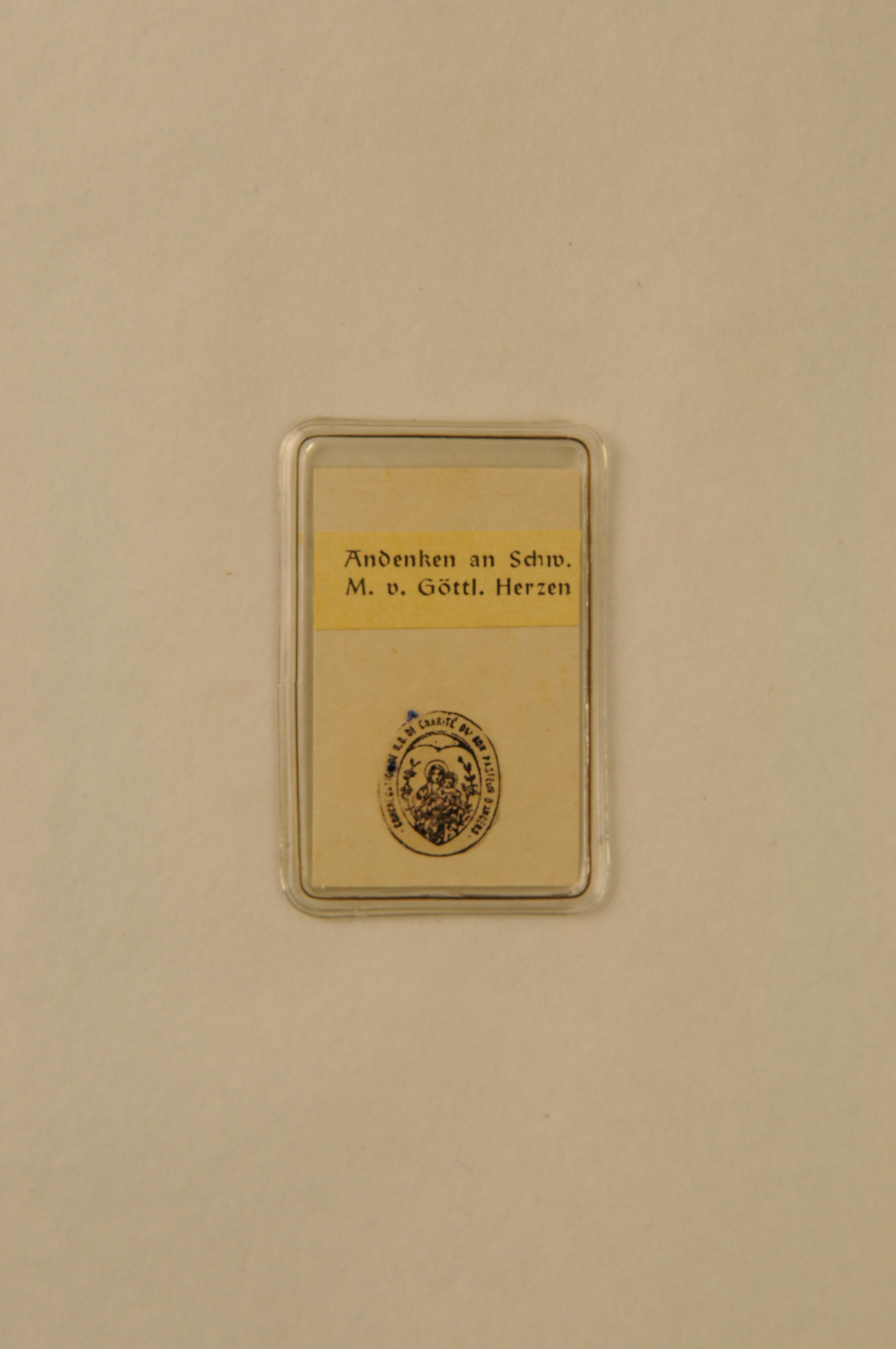 Relikwie, materiaal: foto, papier, textiel; rechthoekige kaart met daarop een foto en een textielreliek van de Zalige zuster M. v. Gottlichen Herzen, op kz. opschrift ‘Andenken an Schw. M. v. Gottl. Herzen’, daaronder het zegel van de Congregation de N.D. de Carité du bon pasteur d’Angers 2,8 x 5,1 cm