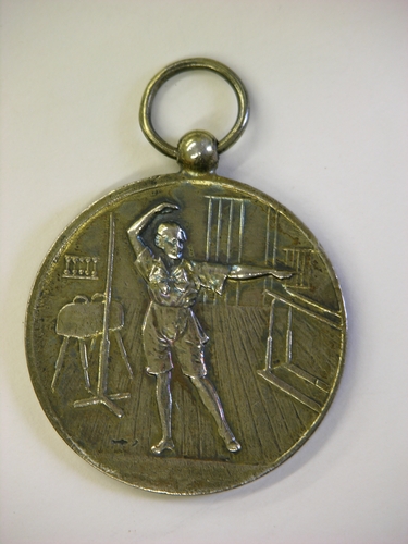 Ronde prijsmedaille; draagpenning met doorboord knopje en draagringetje. Recto: reliëfafbeelding van staande vrouwenfiguur in sporttenue in gymzaal. Verso: inschrift '1e pr. Driek. Gymn. Adsp. Turnsters Eindhoven 9-5-'29. Langs rand omlopende lauwerkrans.