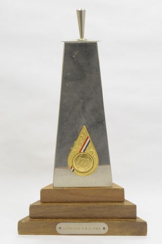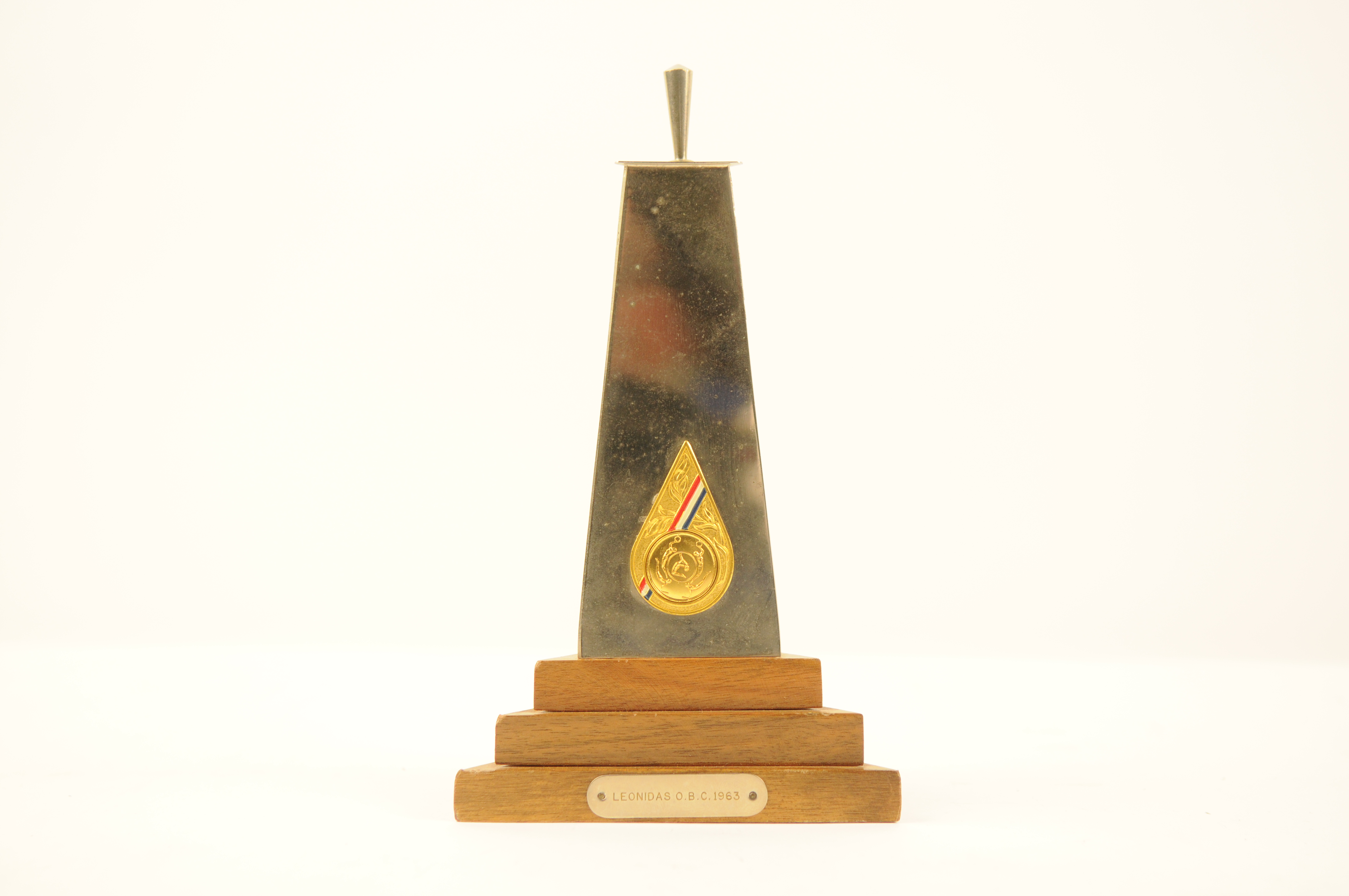 Prijstrofee in de vorm van een gedenknaald/obelisk – 1963, materiaal: verchroomd metaal en hout (standvoet), afmetingen: 22 x 12,5 x 10,5 cm, prijstrofee in de vorm van een driehoekige obelisk met een greepje op de bovenzijde en een driehoekig getrapt basement, tegen de voorzijde een metalen embleem met de Nederlandse kleuren en een medaillon waarop ...