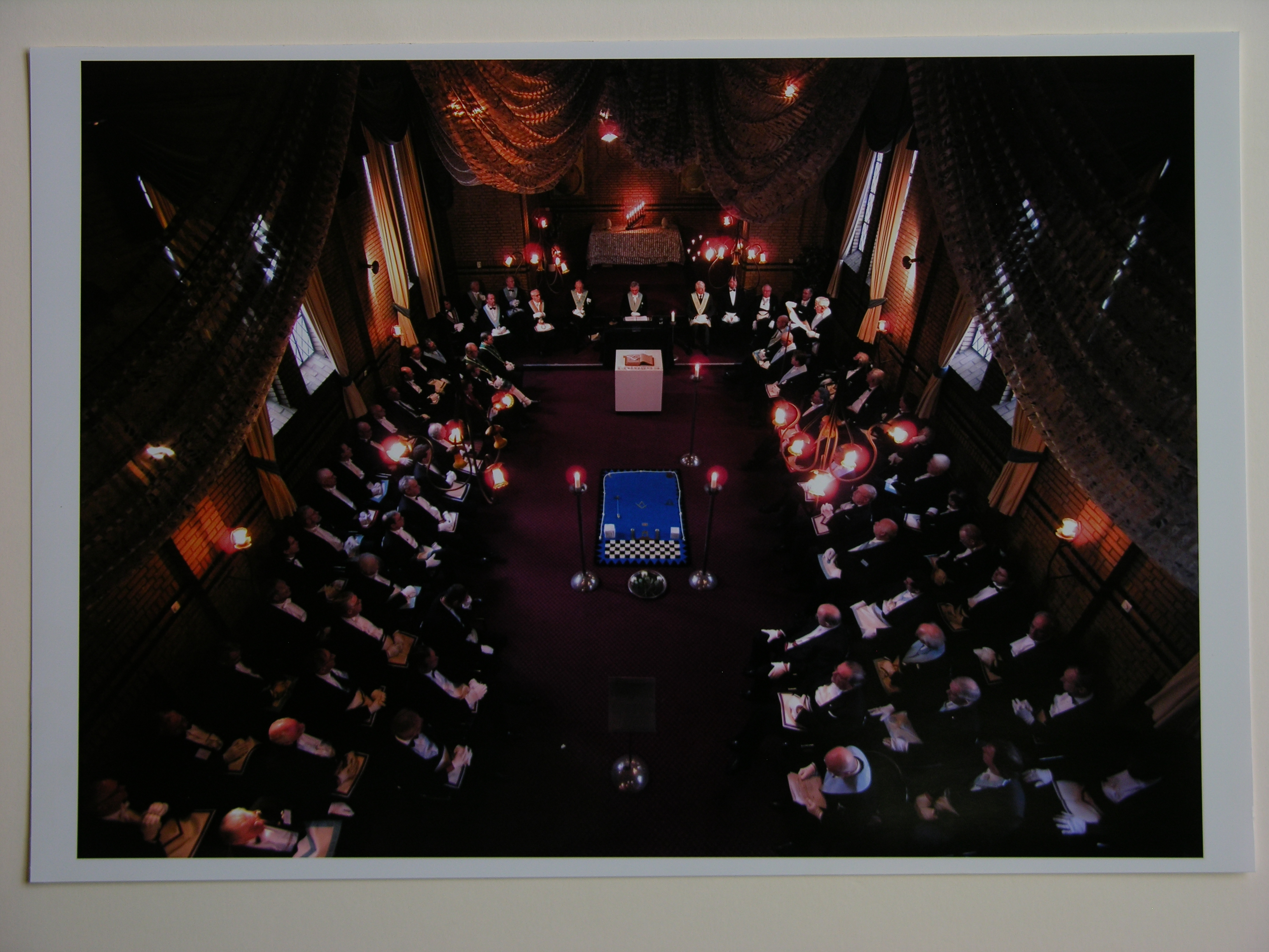 Opvoering van een rituaal, Vrijmetselaarsloge Rosa Alba, Son en Breugel – 2006, kleurenfoto/papier, 295 x 415 mm Opvoering van een rituaal, Vrijmetselaarsloge Rosa Alba, Son en Breugel – 2006, kleurenfoto/papier, 29.5 x 41.5 cm in passe-partout Productie reden: Tentoonstelling 250 jaar Vrijmetselarij in Nederland