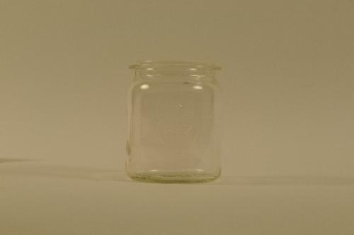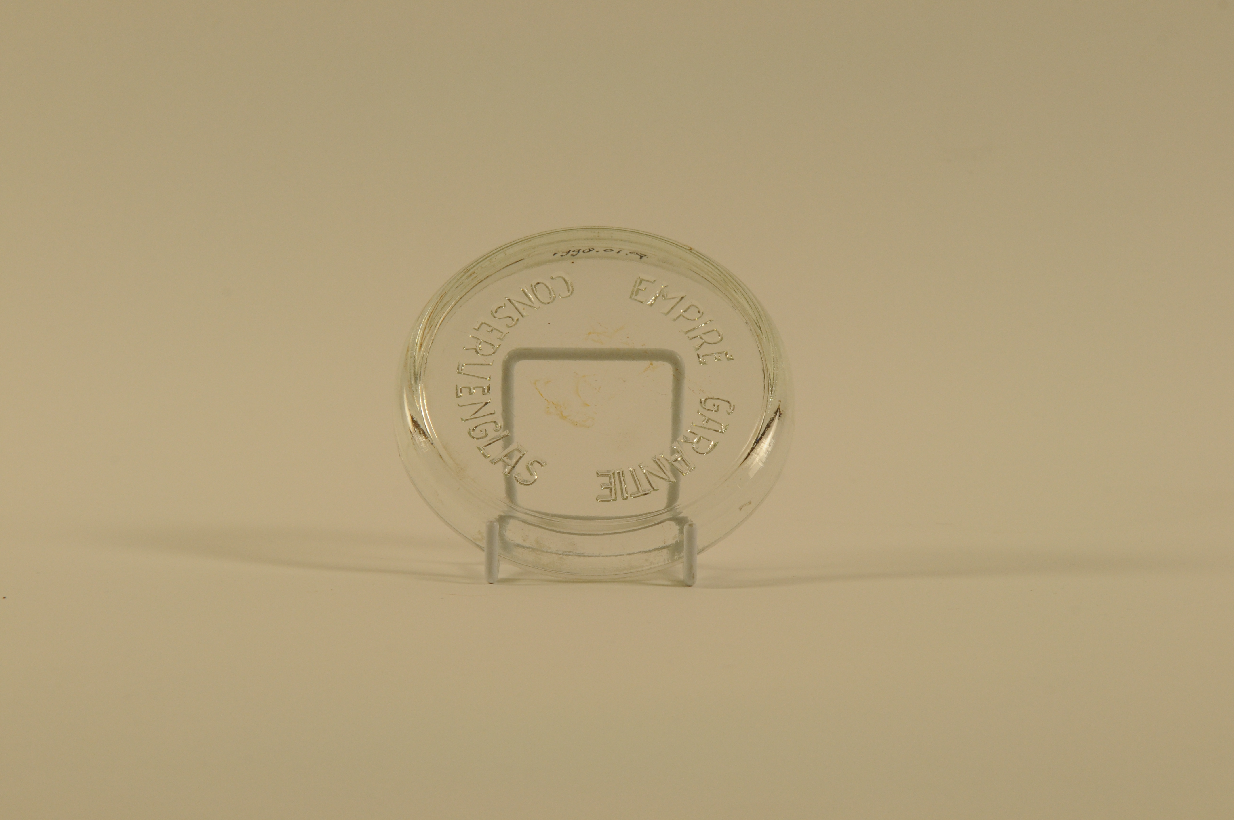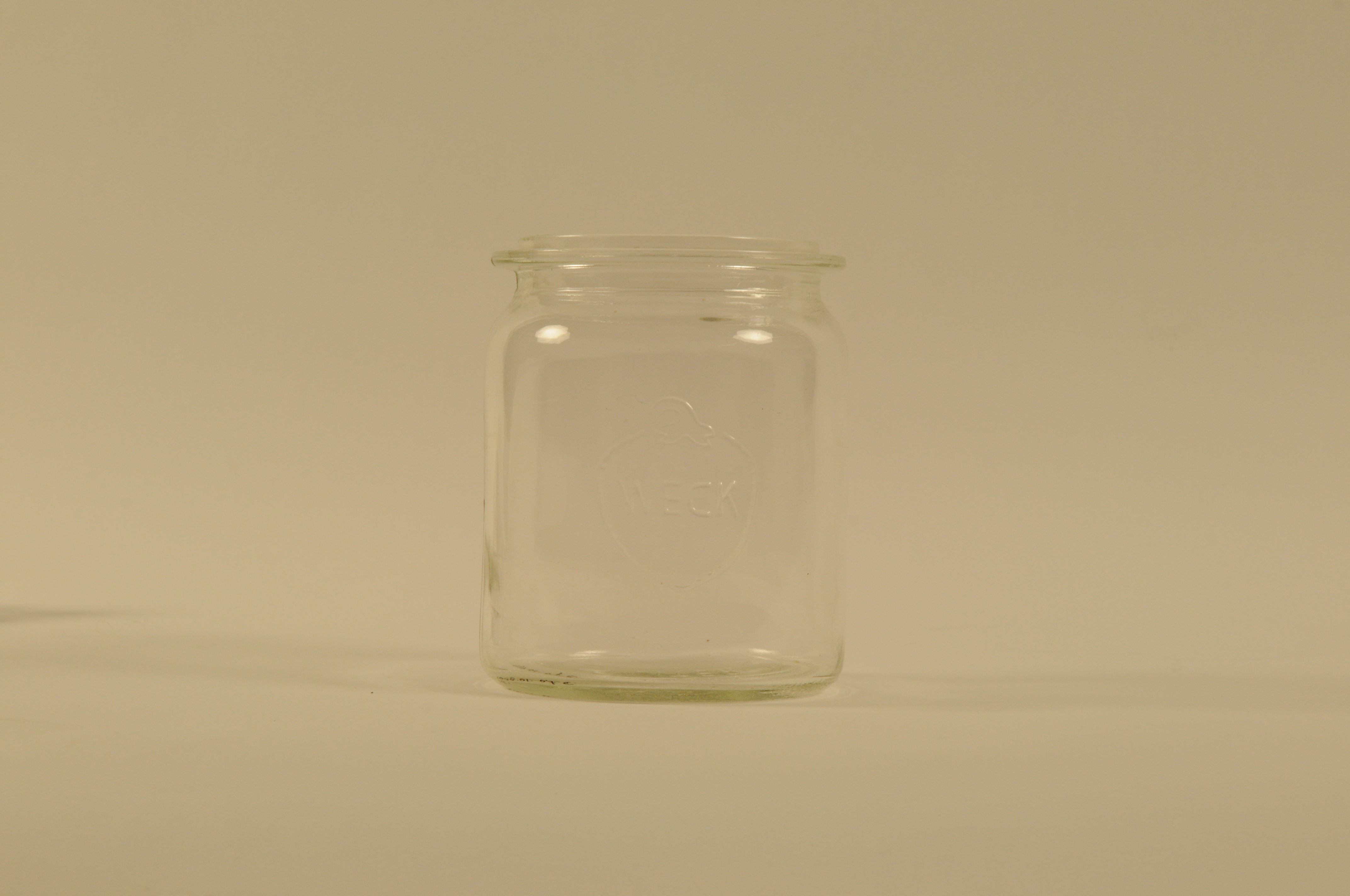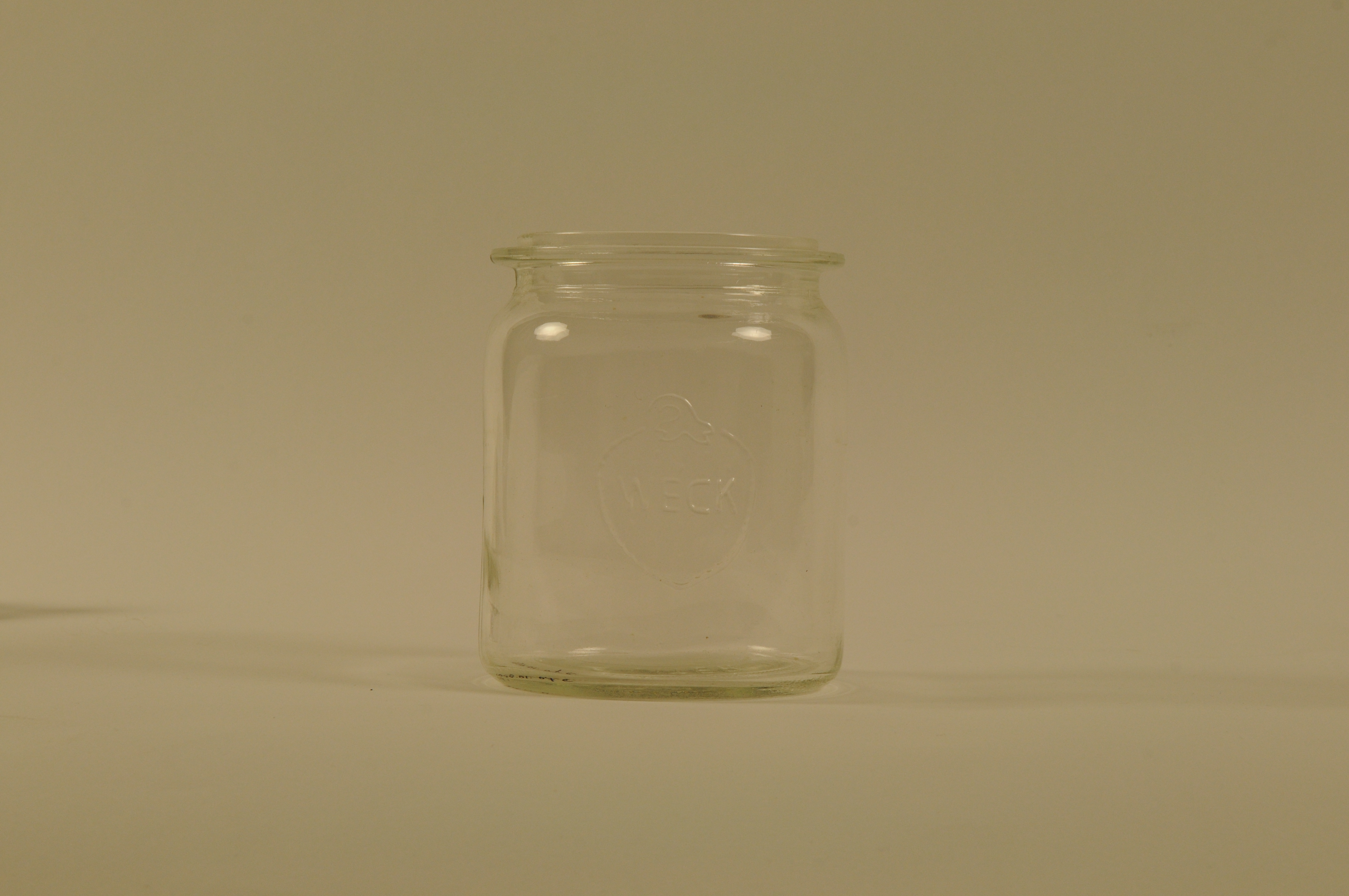 Weckfles met deksel - 3e kwart van de 20e eeuw, materiaal: glas, kleur: doorzichtig/kleurloos, afmetingen:15 x 11 cm, op het deksel in reliëf het opschrift: 'Empire garantie conservenglas', op opstaande wand hwet opschrift: 'WECK'in een schildvormig veld, op de bodem het opschrift '1 Liter Massivrand - 95' Object is aan het MKE geschonken voor de tentoonstelling ...