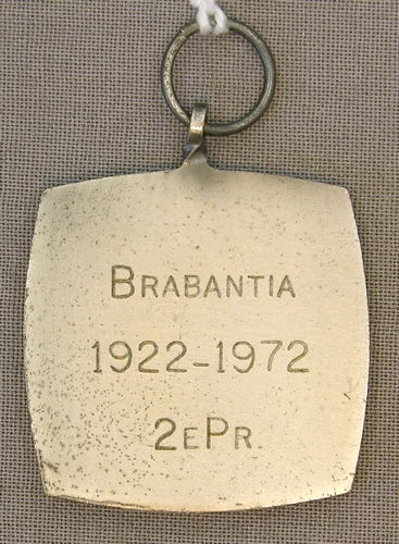 Vierkante sportmedaille/draagpenning met een ophangoogje voor een lint of koord, met op de vz een voorstelling in medaillon van twee voetballers in duel met bal tegen een achtergrond van elkaar kruisende diagonale en loodrechte lijnen en op de kz. het inschrift: “Brabantia 1922 – 1972 2e Pr.” Materiaal nikkel-legering, hoogte 36 mm, breedte 36 mm