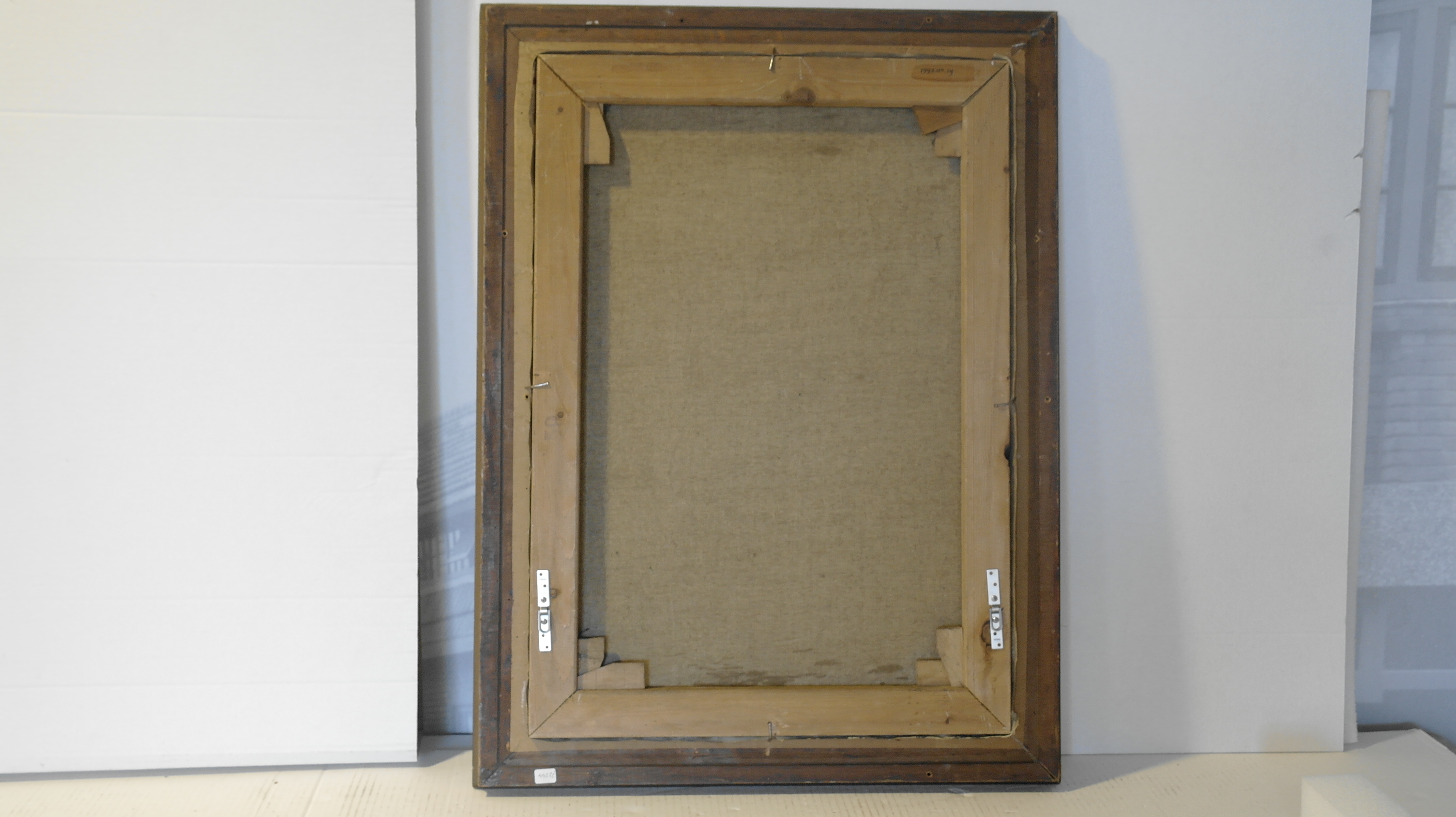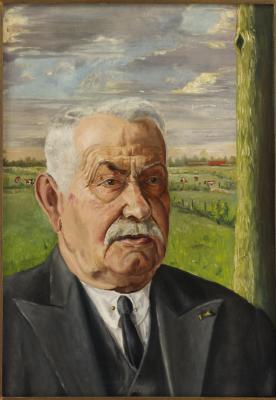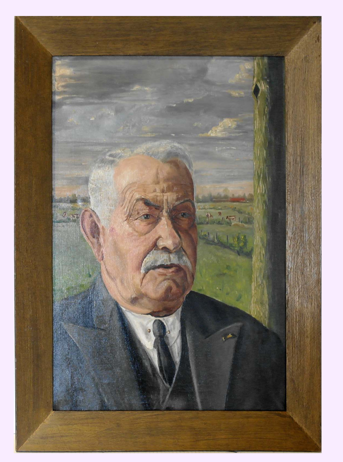 Jan Cornelis Douze (Stevensweert 1866 - ?), vader van de schilder - z.j., olieverf/doek, 59 x 42 cm, ongesigneerd en ongedateerd Portret 3/4 n.r. van Jan Cornelis Douze (Stevensweert 1866 - ?), vader van de schilder, met op de achtergrond weilanden en een langgevel-boerderij, ongesigneerd en ongedateerd