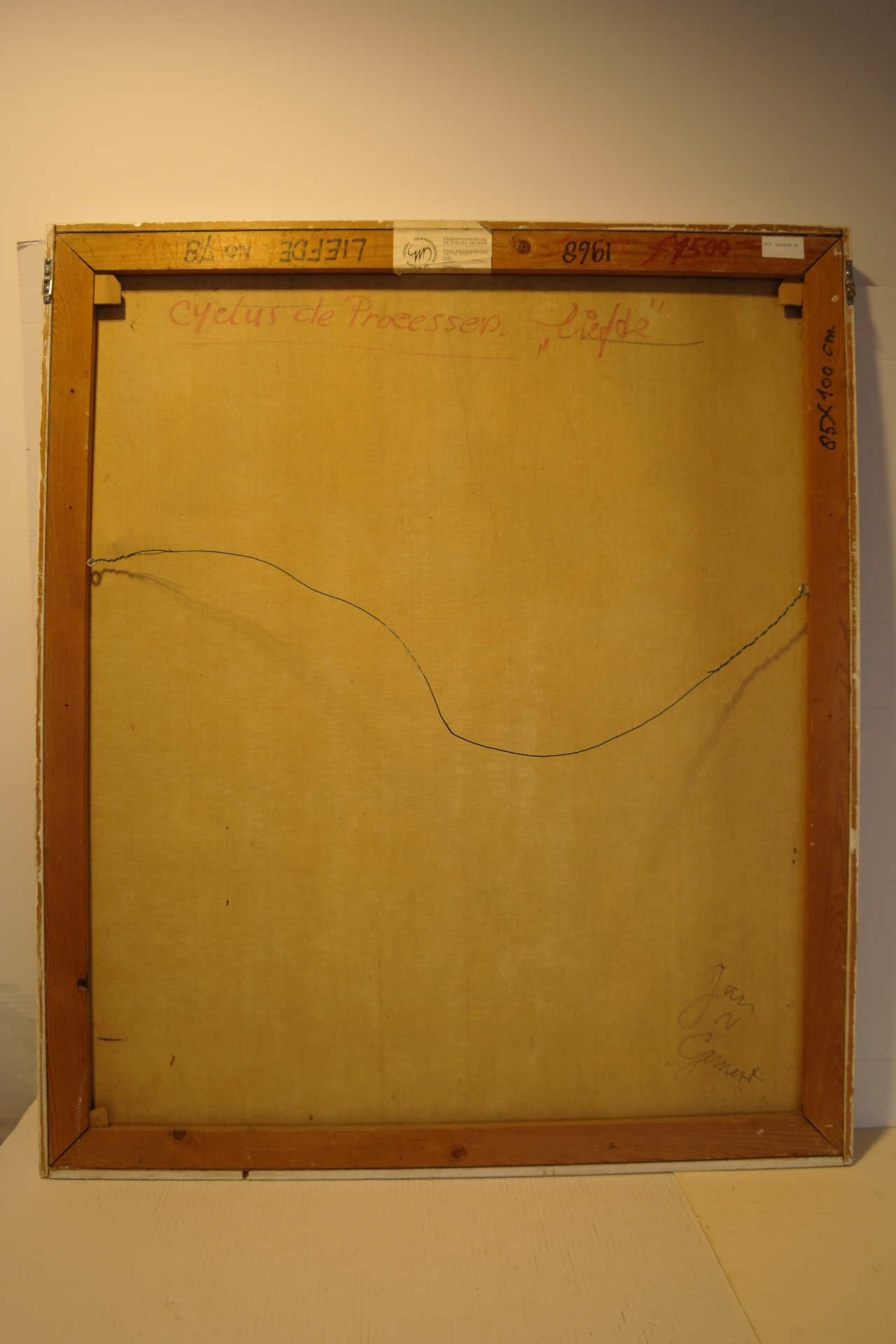 Liefde - 1968, olieverf/doek, 85 x 100 cm, gemonogrammeerd l.o.: G in rechthoekje, geannoteerd a.z. doek: ' Cyclus de Processen. 'liefde'', gesigneerd a.z. doek: ' Jan v Gemert', gedateerd, geannoteerd en genummerd a.z. lijst: '1968 LIEFDE no 78'.