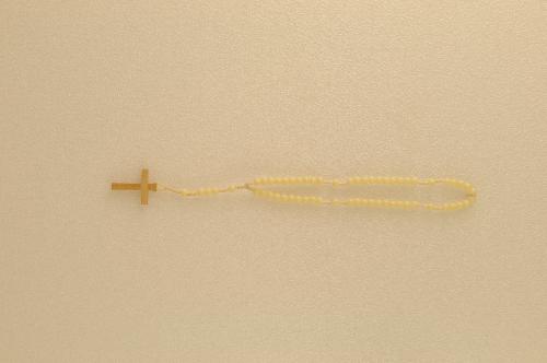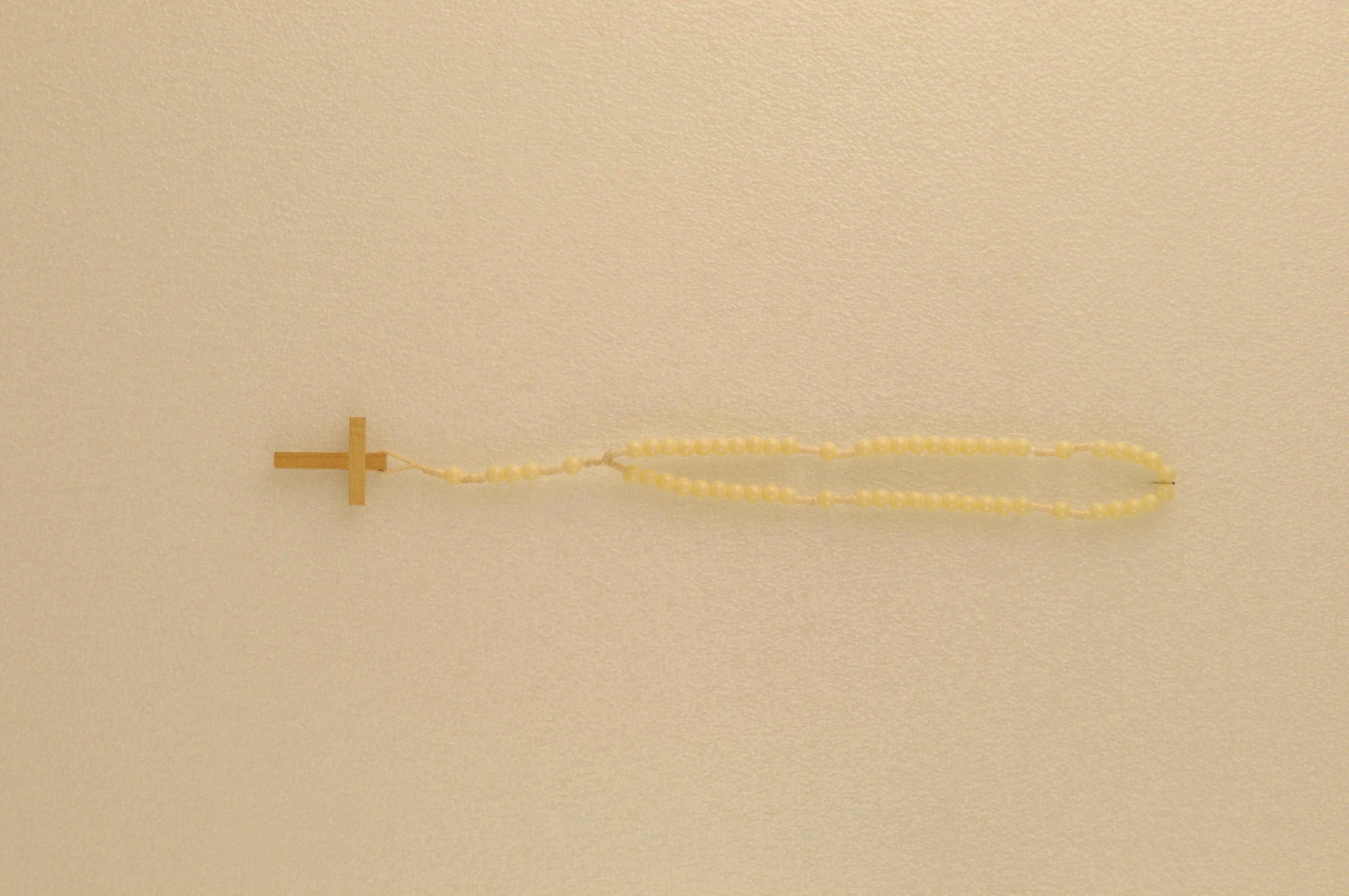 Rozenkrans – z.j., hout, kunststof en katoen, een zeer eenvoudige rozenkrans met blankhouten kruisje, witte kunststof kralen en een geknoopt katoenkoord, 5 x 10 weesgegroetjes, 1 x 3 weesgegroetjes en zes onzevaders, 28 x 3 x 0,5 cm