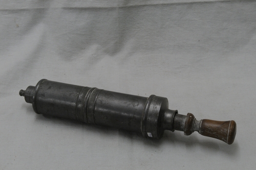 Veterinaire klisteerspuit met kort uiteinde zonder pijpvormige punt, tin, 37 x 7 cm, cylindervormige bus van tin met schroefdraad afsluitelement waarin gedraaid houten druk-handvat bestaande uit drie losse delen die middels een schroefdraad aan elkaar werden bevestigd