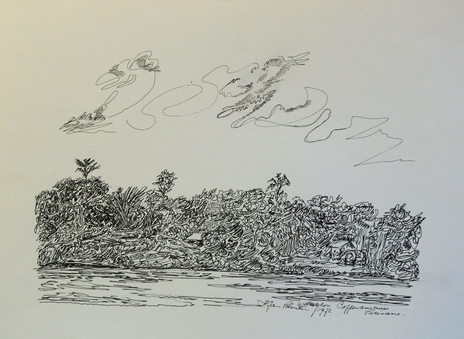 Wittagra Coppenamerivier Suriname – 1972, oostindische inkt/papier, 230 x 335 mm, gesigneerd, gedateerd, geannoteerd en gelocaliseerd r.o.: H. JAN SCHOUTEN 1972 Wittagra Coppenamerivier