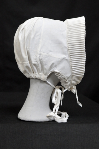 Cornetmuts (religieus), materiaal: katoen, kleur: wit, pijpjesmuts van de Zusters van Genakel in Tilburg, muts met open kruin gerimpeld, pas met middennaad 8 cm breed, voorstrook 6,5 cm breed, grof geplooid, één helft met plooien, andere helft zijn de plooien eruit naar zij- en onderkant, onderkant muts band doorgehaald, muts apart onder de kin gesloten, ...