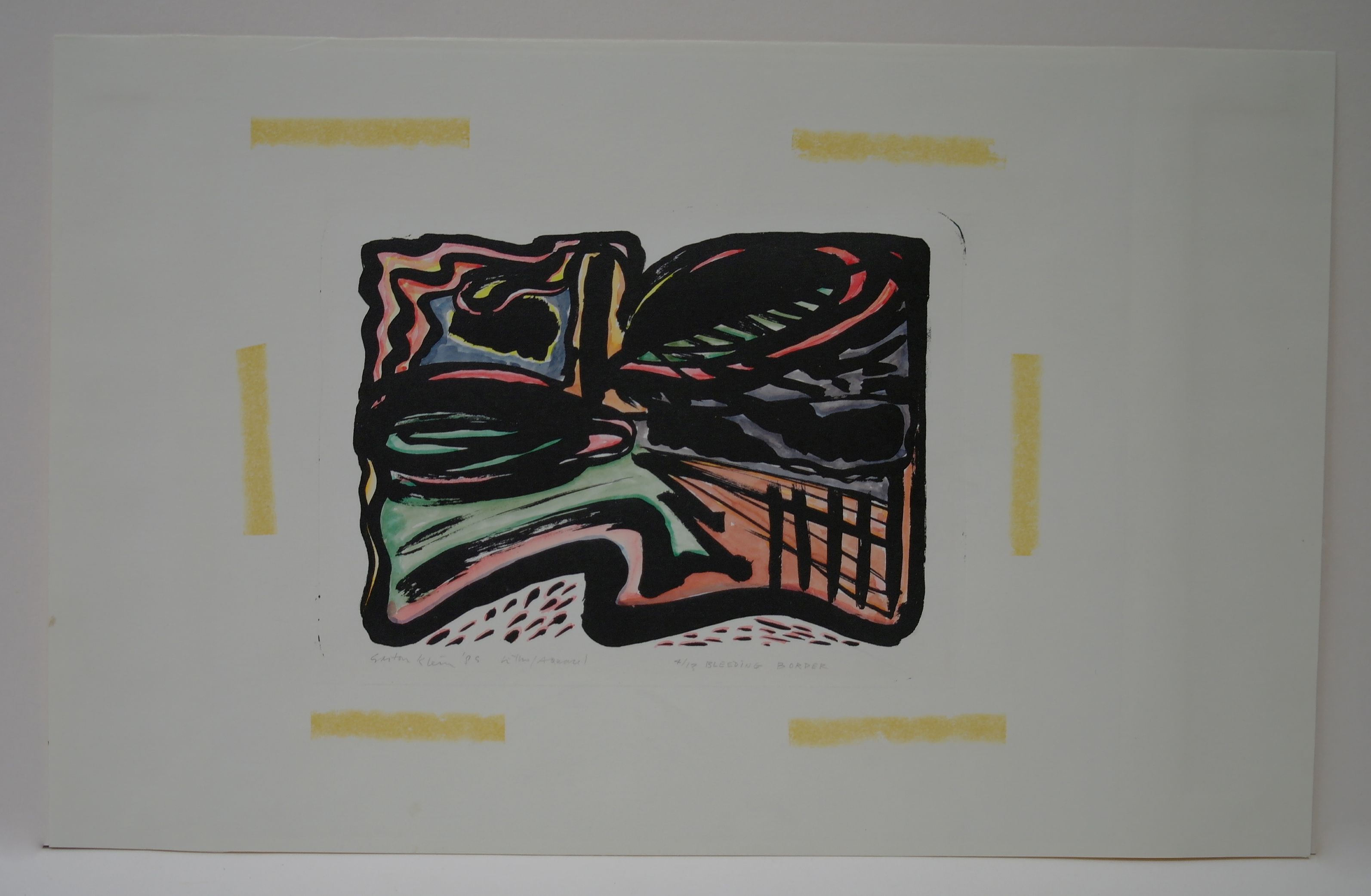 in lijst achter glas oud gemeente nummer F 874 gesigneerd, gedateerd, geannoteerd, genummerd en getiteld in potlood onder voorstelling: gaston klein '85 litho/aquarel 4/13 bleeding border