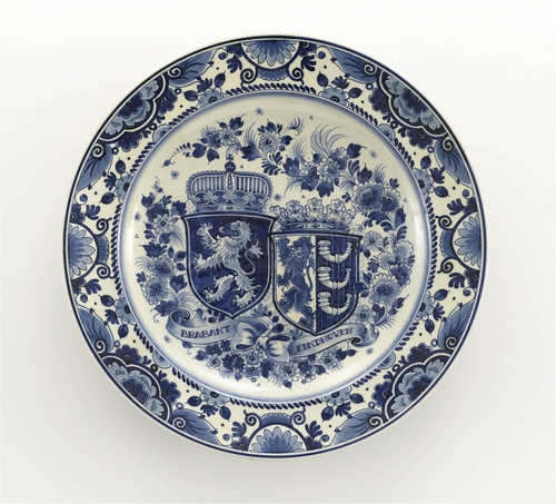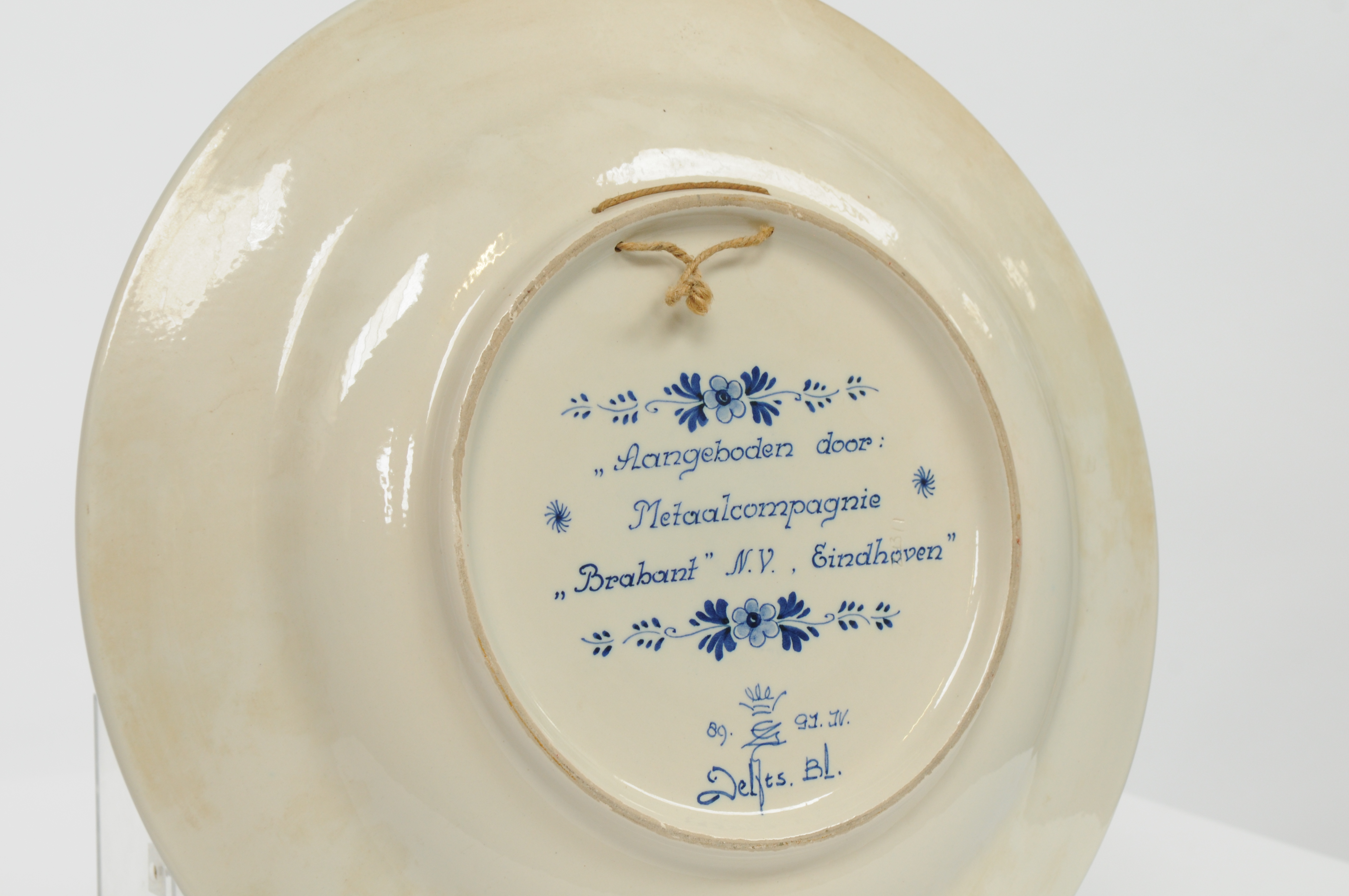 Aardewerken herdenkingsbord, Delfts blauw, aangeboden door de Metaalcompagnie Brabant n.v. te Eindhoven