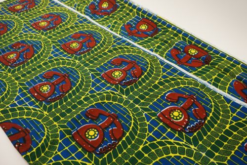 Textiel-ontwerp 'Ileo', materiaal: katoen (bedrukt), kleur: blauw, geel, donker rood, donker groen, lengte 138 cm, breedte 122 cm, textiel-ontwerp vervaardigd bij Vlisco Helmond, in de rand is gedrukt 'veritable wax hollandais Vlisco', imitatie-batik