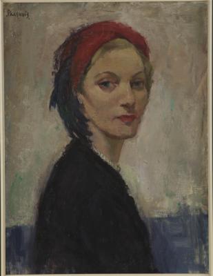 Portret en face van een blonde vrouw met een rood hoedje met (struis)vogelveren op het hoofd