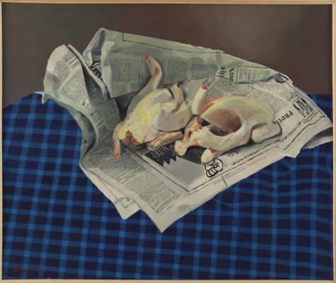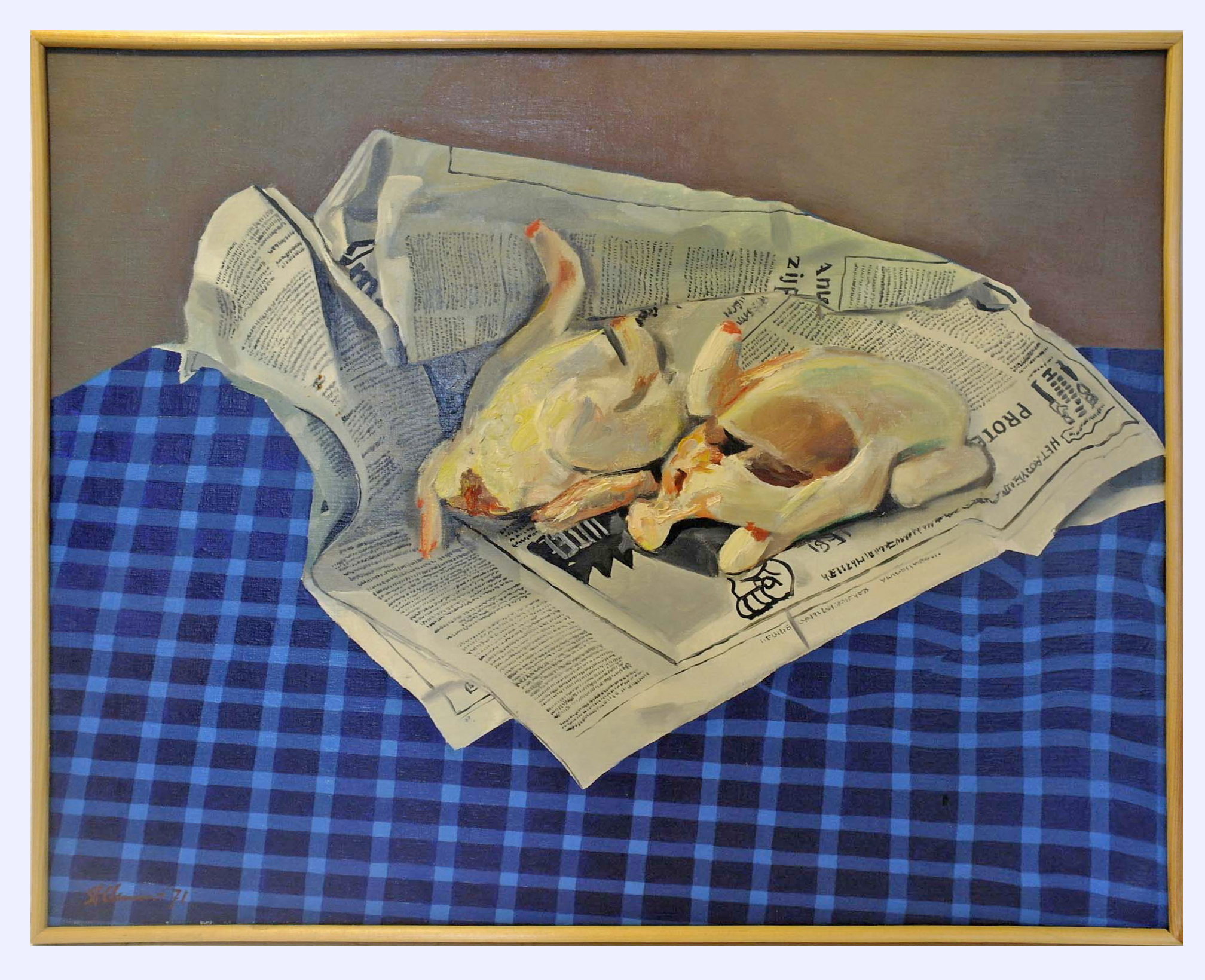 Stilleven met haantjes op krant - 1971, olieverf/doek, 50 x 60 cm, gesigneerd en gedateerd l.o.: F Clement '71