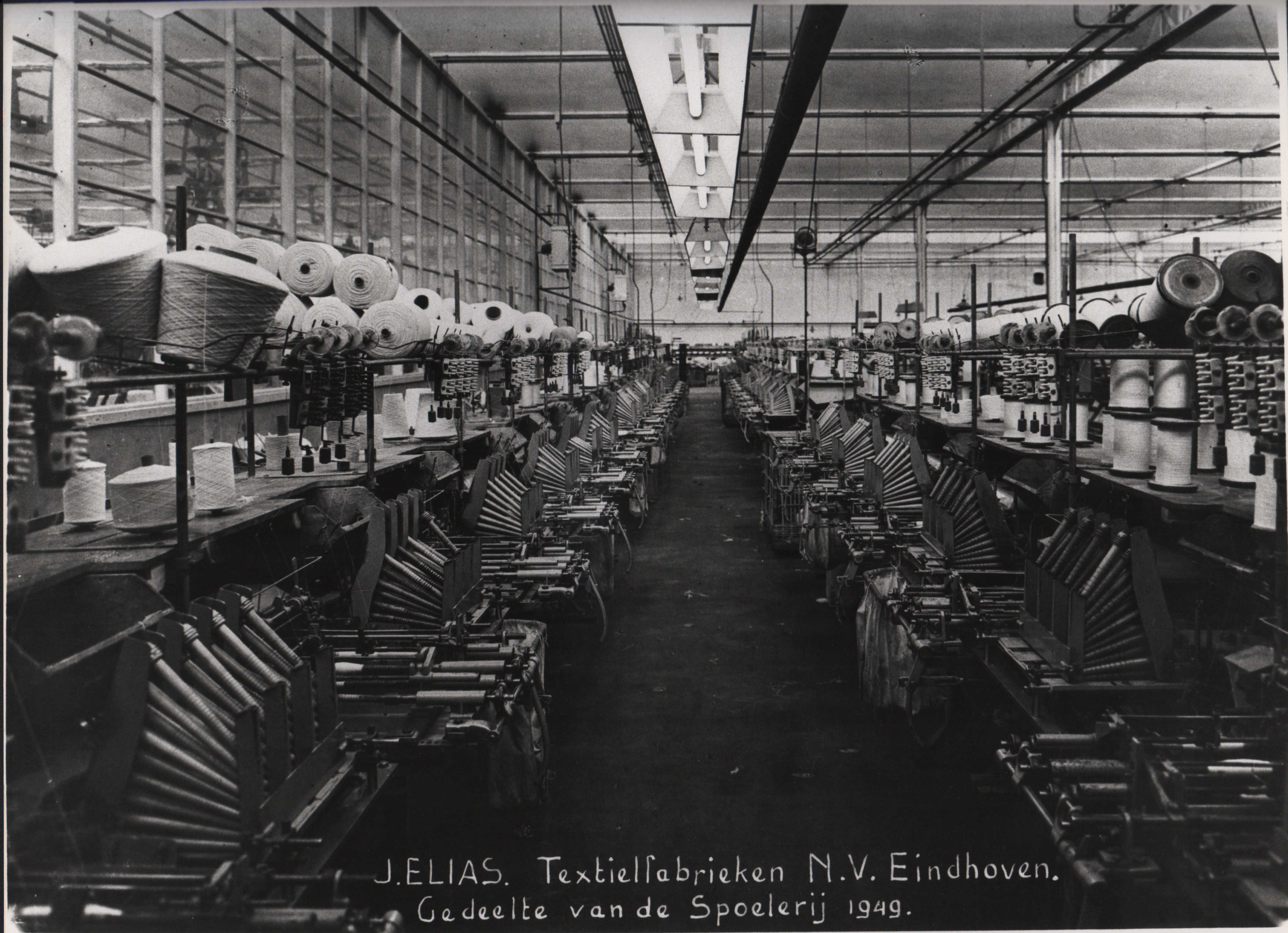Interieurfoto van een gedeelte van de spoelerij van J.Elias Textielfabrieken N.V. Eindhoven, 1949.