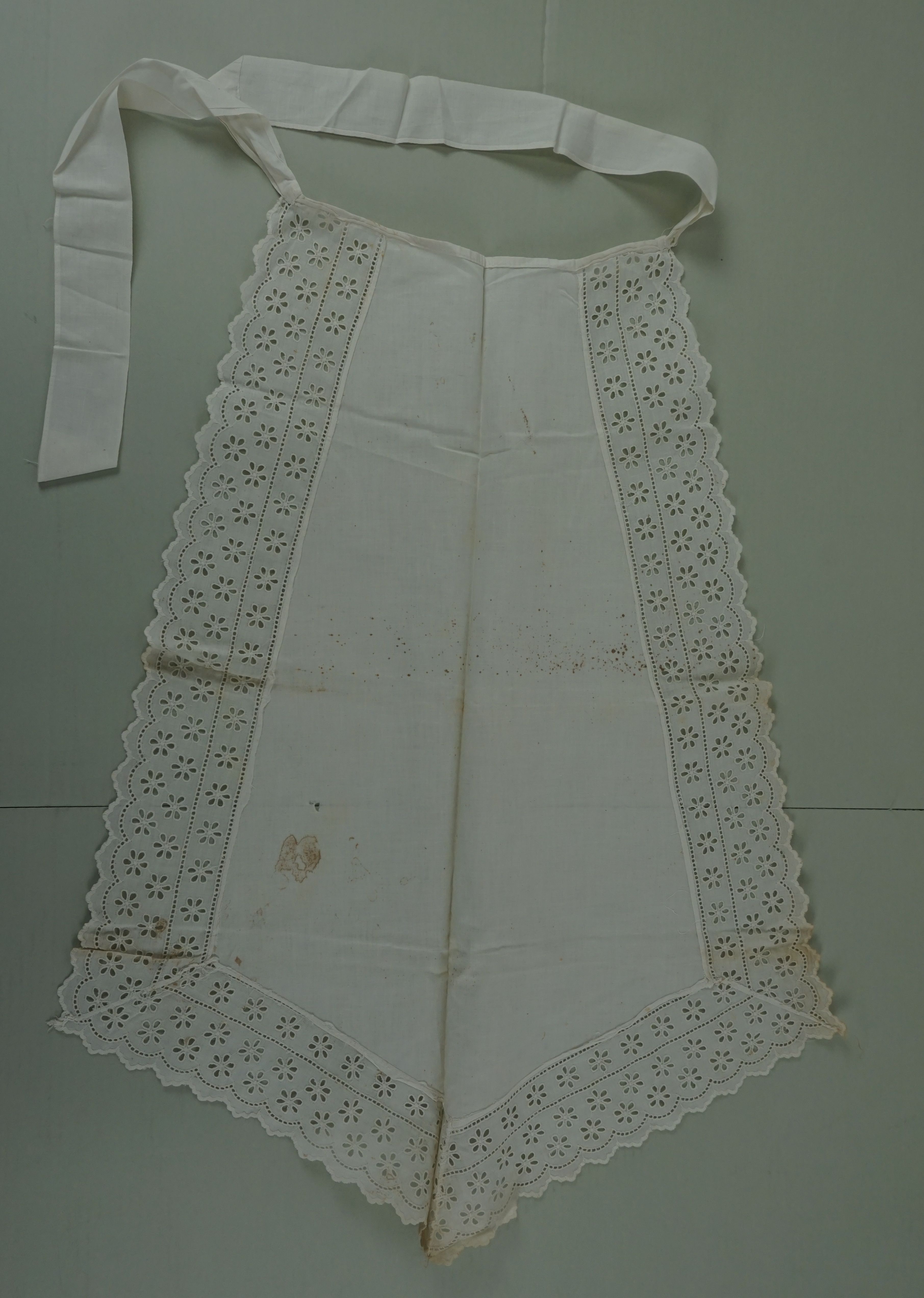 Halve schort, materiaal: katoen, kleur; wit, lengte 68,5 cm, breedte 30 cm, rondom afgezet met 8 cm brede broderiekant, twee taillestrikken met een lengte van 43,5 cm en een breedte van 4,5 cm
