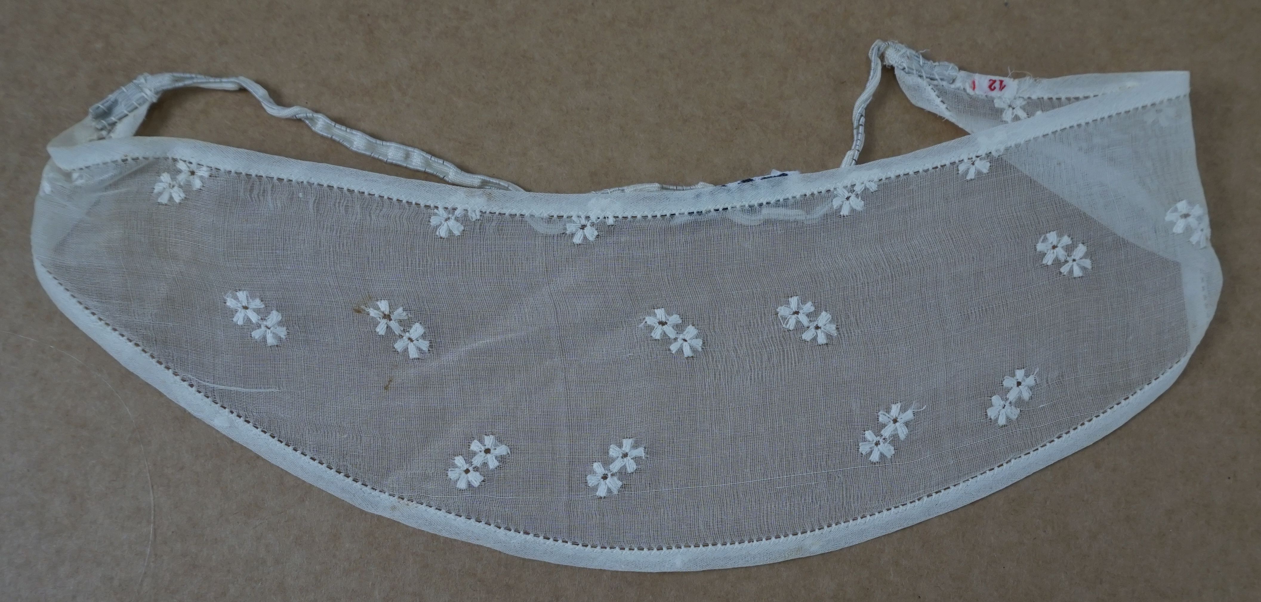 Haarband en manchetten voor dienstbode, materiaal: batist, kleur: wit, lengte 32,5 cm, hoogte 7,5 cm, met hoedenelastiek bloemmotiefje geborduurd batist, confectie, wasmerkje 12, machetten 17,5 cm lang, 7 cm breed, wasmerkje 12